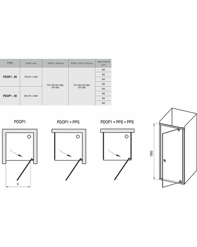 PDOP1 всегда открываются наружу. Левый или правый вариант входа устанавливаются простым поворотом двери "вверх ногами" при монтаже. При использовании регулирующих профилей (PNPS) душевые двери идеально приспосабливаются к неровностям строительных проемов.