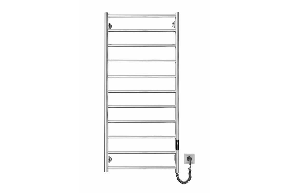 Коннектор для подключения в розетку с любой стороны. Комплект скрытого подключения. Имеет 11 ребер и стояк из круглой трубы. Изготовлен из полированной нержавеющей стали без хромирования. Варианты покрытия: полированный или сатин, черный мат, белый глянец, золото, бронза, золото сатин, белый мат. Мощность 125 Вт. Дополнительно для удобства использования можно оснастить крючками. Гарантия – 20 лет на корпус / 5 лет на электрическую часть.
