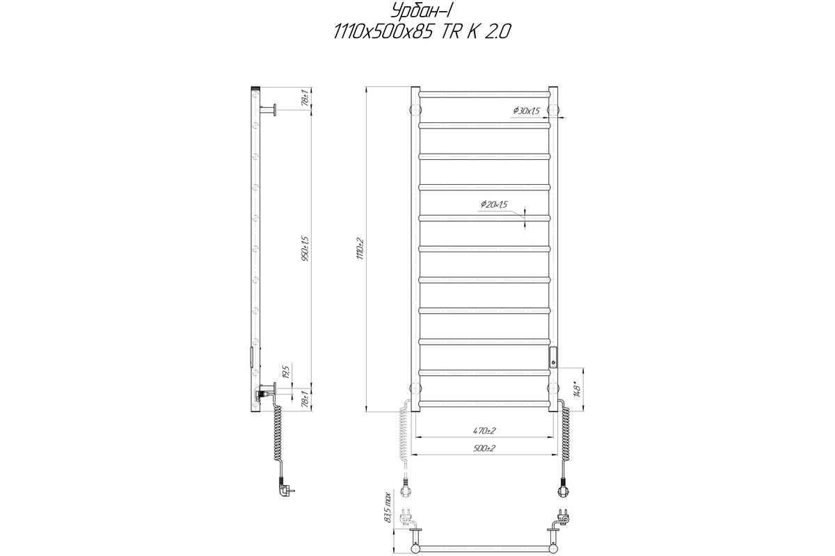 Полотенцесушитель электрический бытовой Урбан-I 1110x500/85 TR K 2.0. Оборудована таймером-регулятором 2.0 - первый смарт-блок управления:
