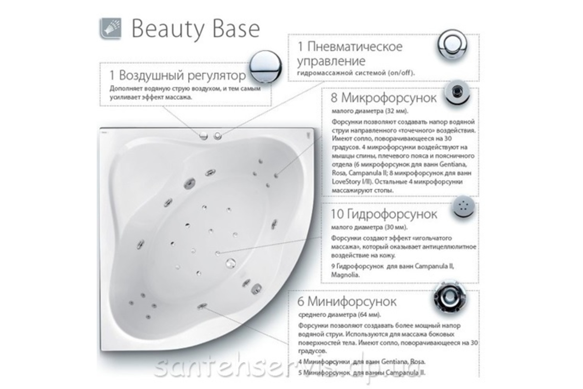Секрет молодости и красоты. Самые современные гидромассажные системы с разноплановыми форсунками, благодаря которым оказывается антицеллюлитное воздействие на кожу. Системы Beauty можно укомплектовать дополнительным оборудованием: хромотерапией, ароматерапией, подводным освещением или дезинфекцией.