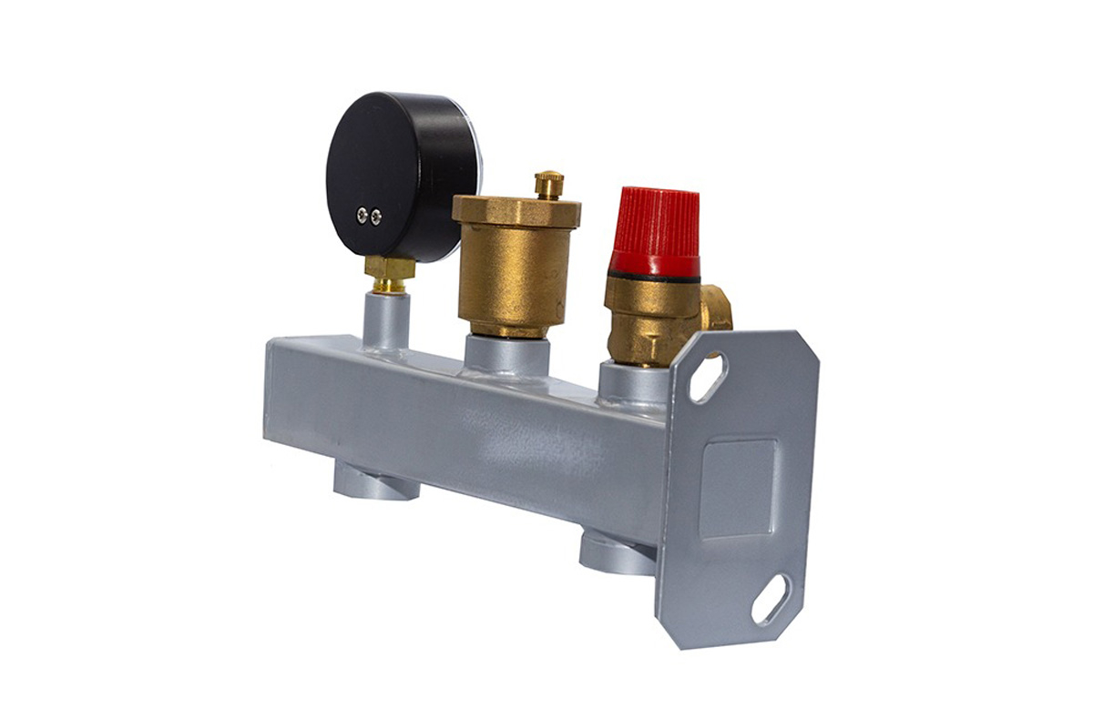 Группа безопасности комплектуется автоматическим поплавковым воздухоотводчиком, предохранительным клапаном и манометром. Изделие имеет фланец для консольного крепления к стене.