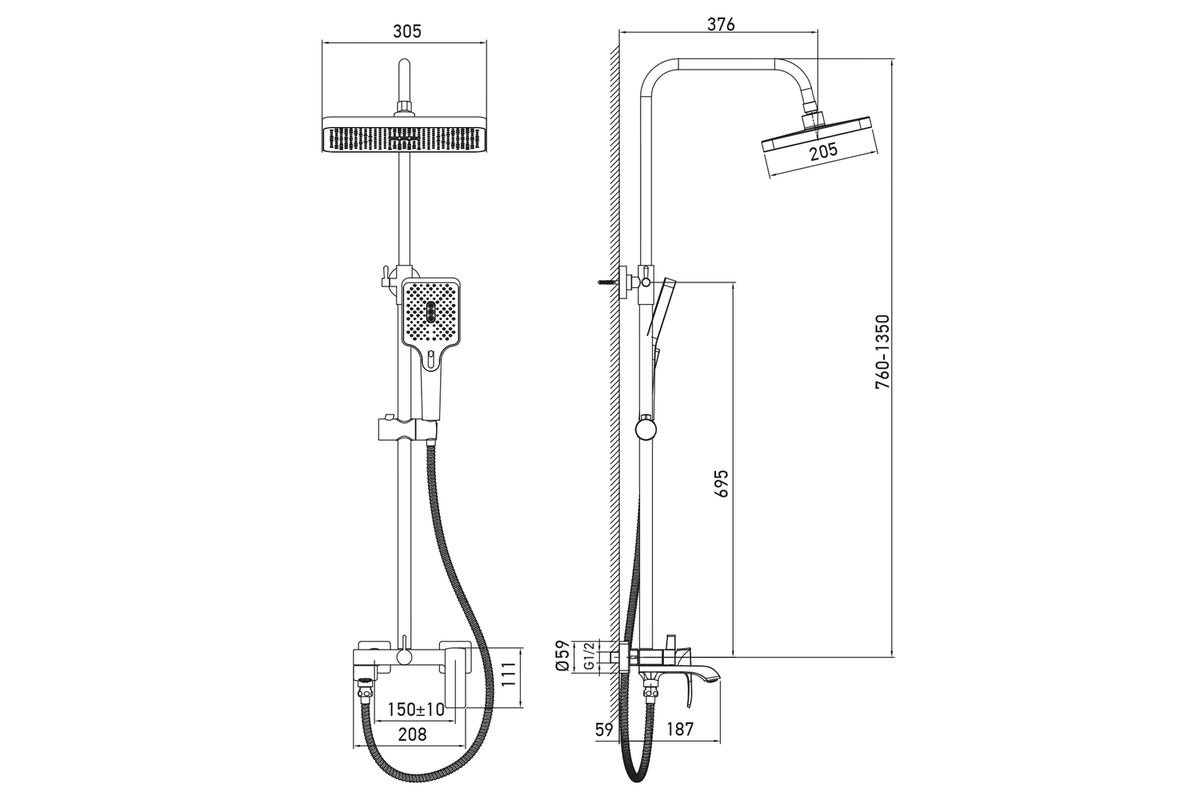 Шланг 150 см, ручная лейка, потолочная лейка, чашки, эксцентрики, резиновые прокладки, держатель для лейки