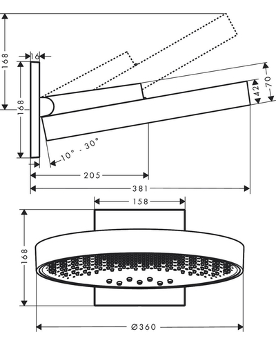 Верхний душ, Hansgrohe Rainfinity 360 3jet, матовый черный (26234670) - выполнен в ярком современном дизайне. Лейка душа крепится на кронштейне и дает возможность менять угол направления потоков, что удобно для людей разного роста.