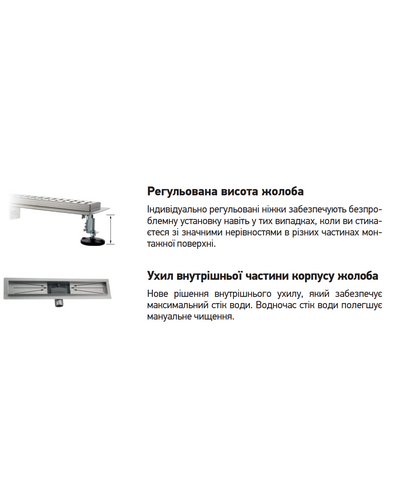 Решетки изготовлены из нержавеющей стали SUS 304, которая характеризуется стойкостью к коррозии, моющим средствам и механическим повреждениям. Внутри находятся фильтры, не пропускающие в канализацию жесткие частицы.