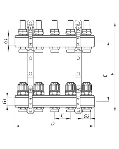 Коллекторный блок со встроенными расходомерами выпускается для распределения теплоносителя к потребителям в системах водяного отопления – радиаторам, конвекторам, петлям теплого пола, обогрева открытых площадок. На выходах прямого коллектора установлены настроечные клапаны с расходомерами, обратный коллектор оснащен термостатическими клапанами (ручные, с возможностью оборудования сервоприводами).