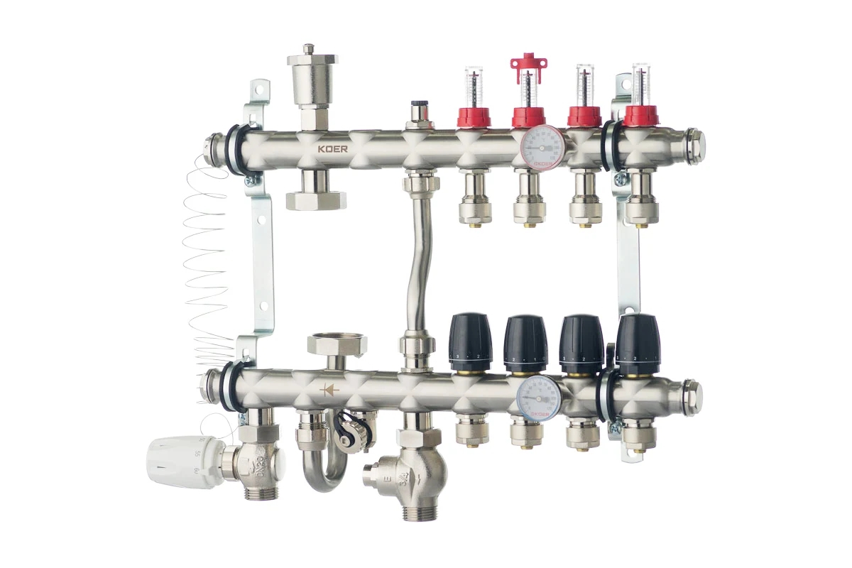 Арматура коллектора KOER изготовлена из высококачественной сантехнической латуни CW617N с никелевым покрытием.