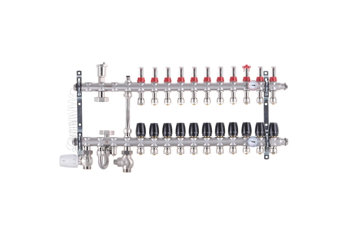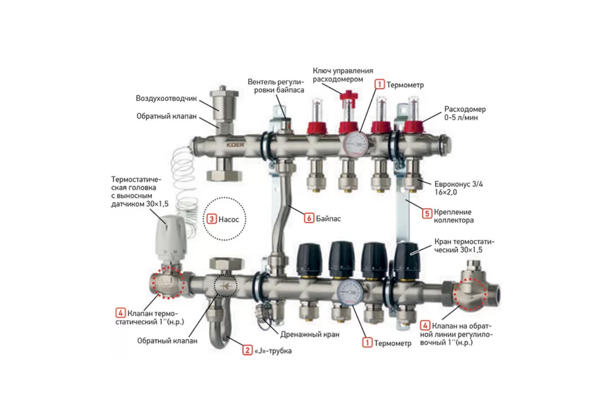 Выходы обратного коллектора блока оборудованы термостатическими, подающего – настроечными микрометрическими клапанами.