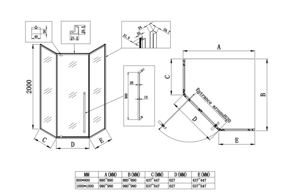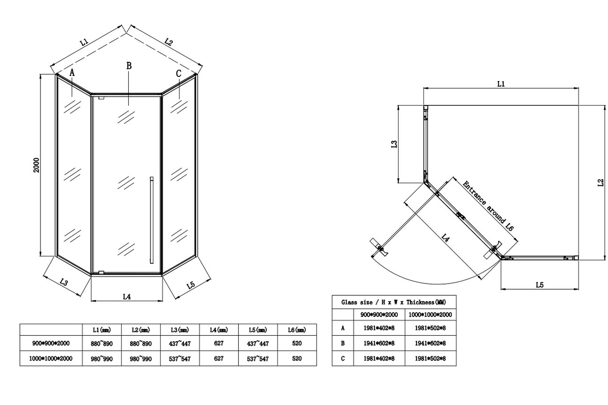 • Фиксированные стеклянные панели - 2, стеклянные двери - 1, профили, ручка, комплект петель, комплект крепежных деталей, уплотнительный набор, заглушки