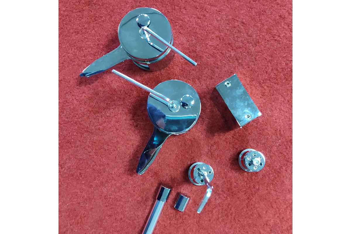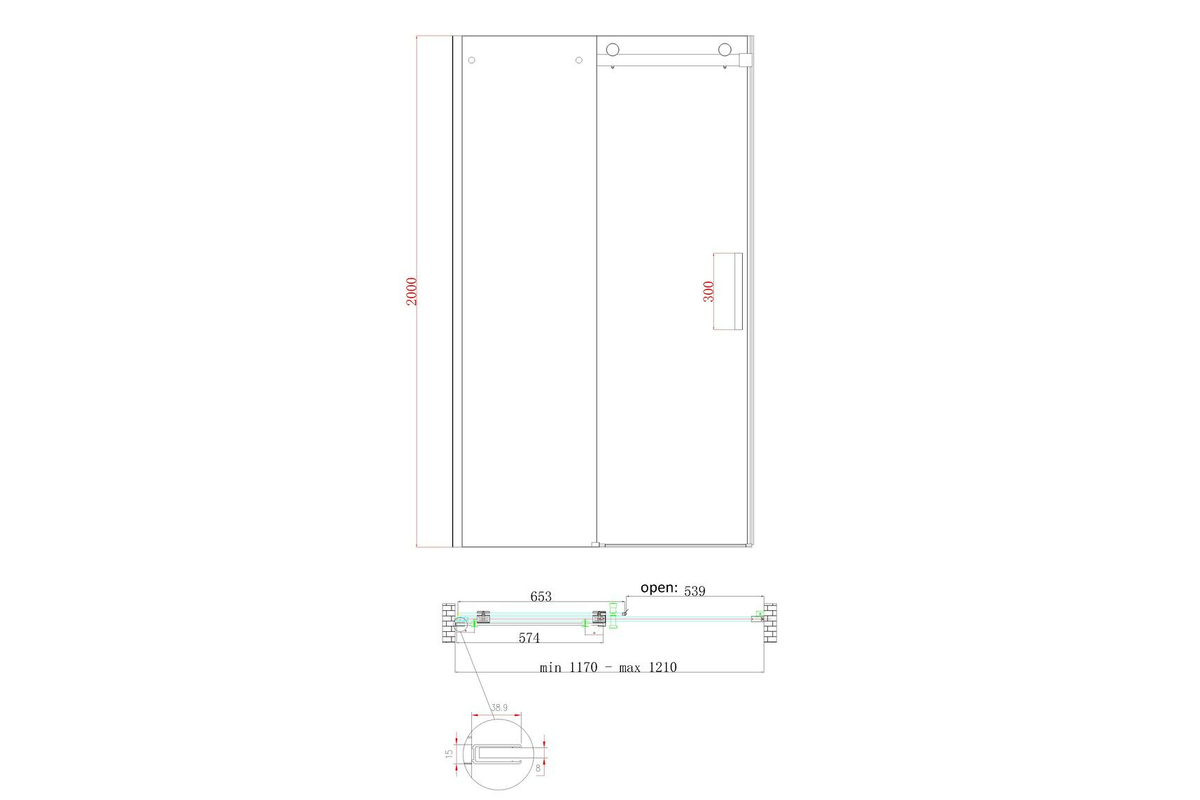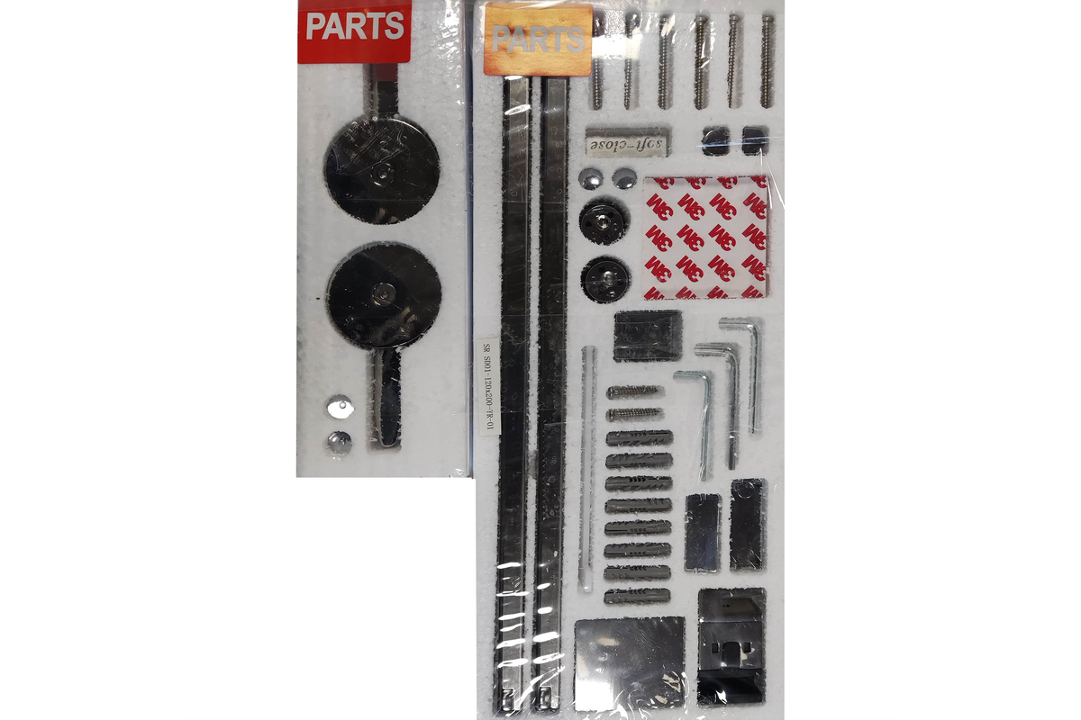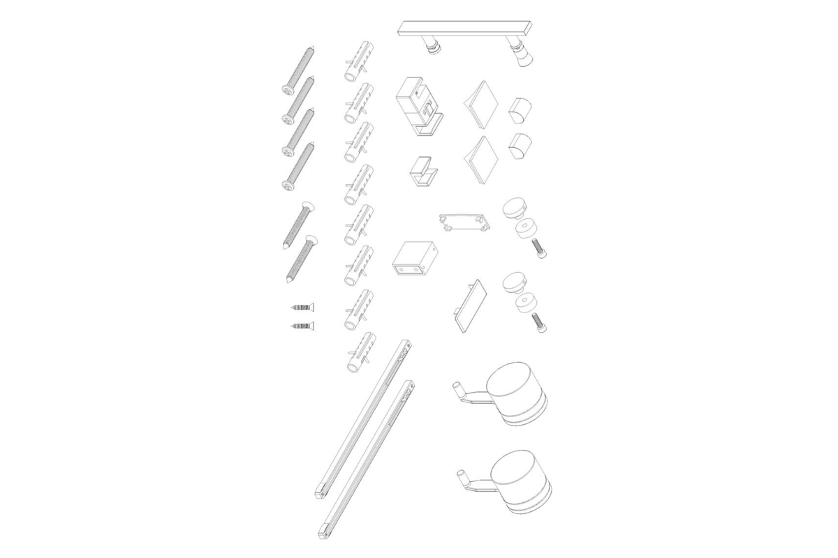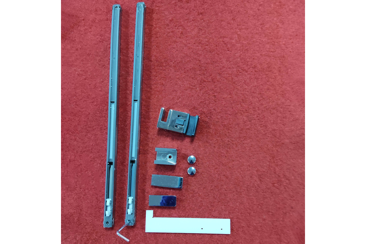 • Глухое стекло, стеклянная дверь, профиль, верхняя рейка, нижняя алюминиевая водонепроницаемая планка, ручка, верхние ролики, система нижних ползунов, комплект крепежных деталей, набор уплотнителей, заглушки