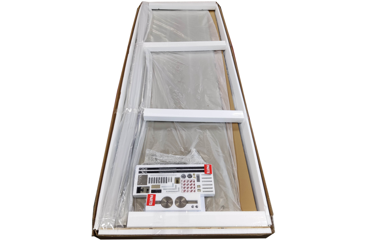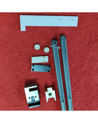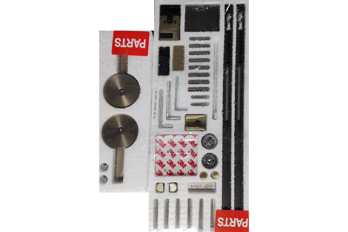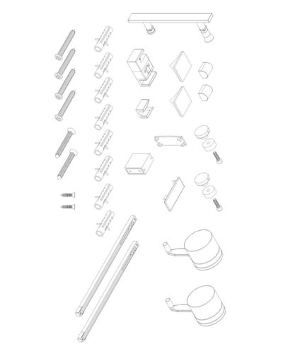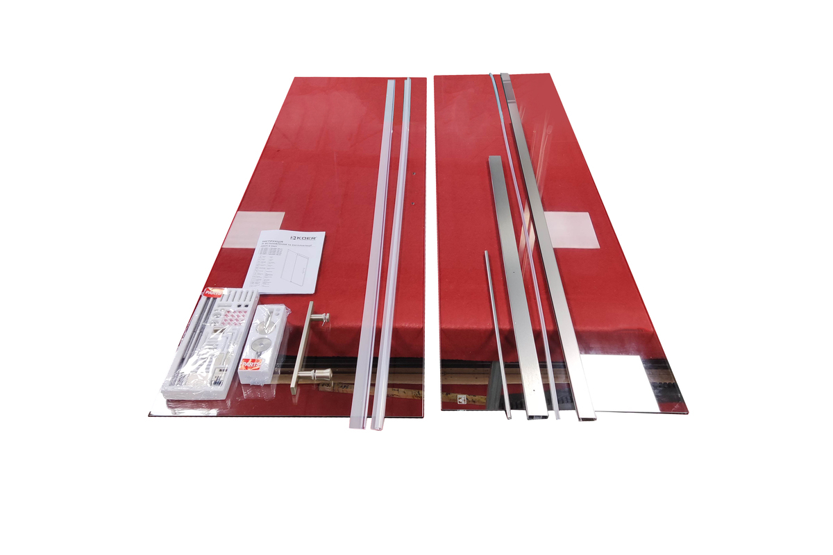 • Глухое стекло, стеклянная дверь, профиль, верхняя рейка, нижняя алюминиевая водонепроницаемая планка, ручка, верхние ролики, система нижних ползунов, комплект крепежных деталей, набор уплотнителей, заглушки