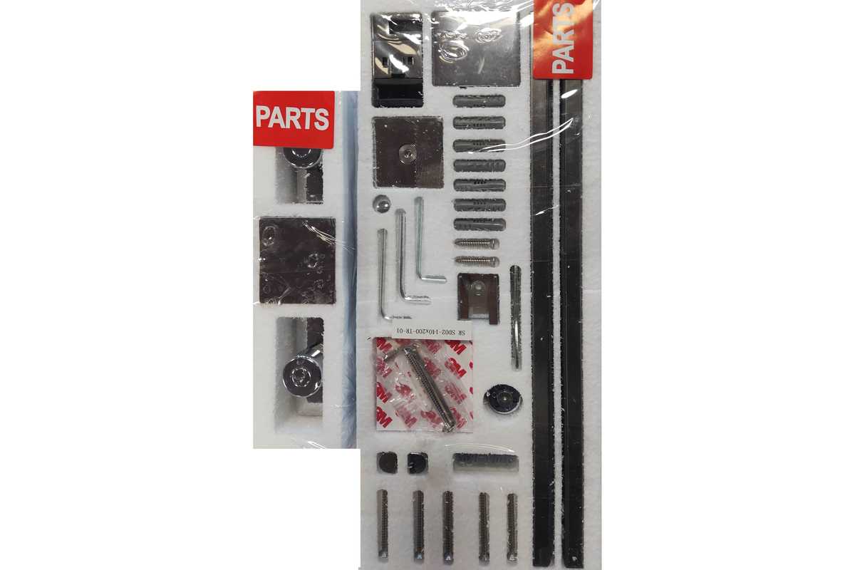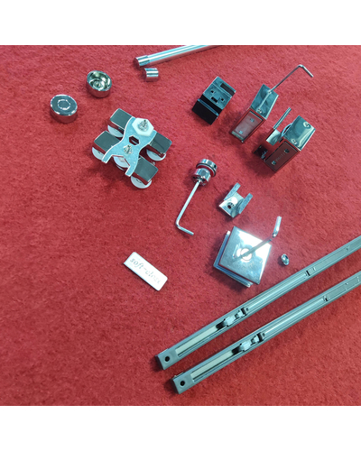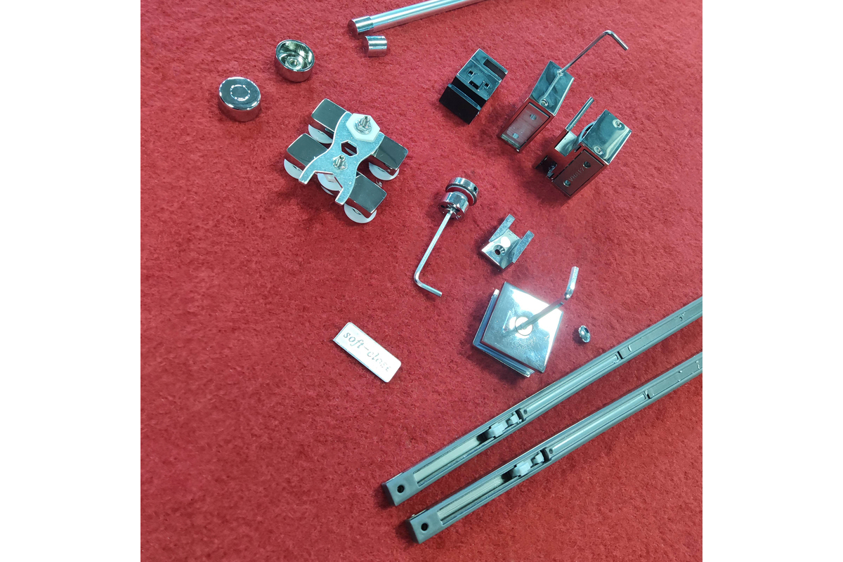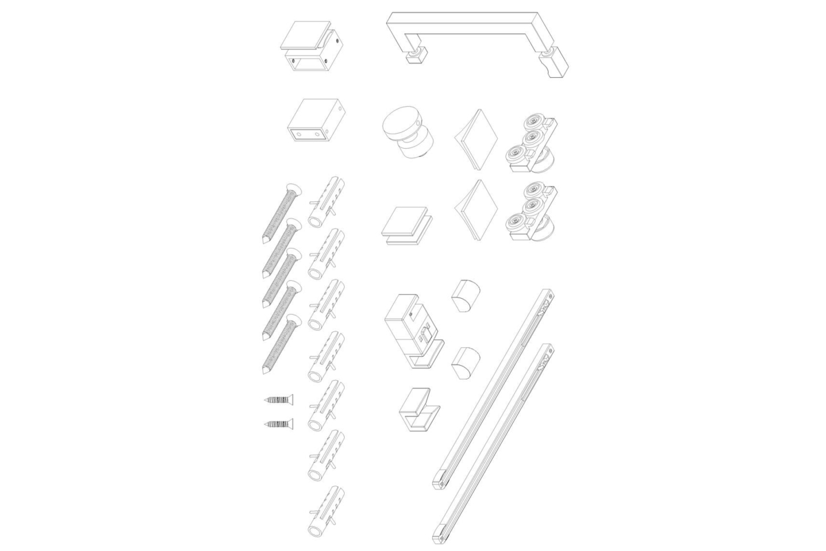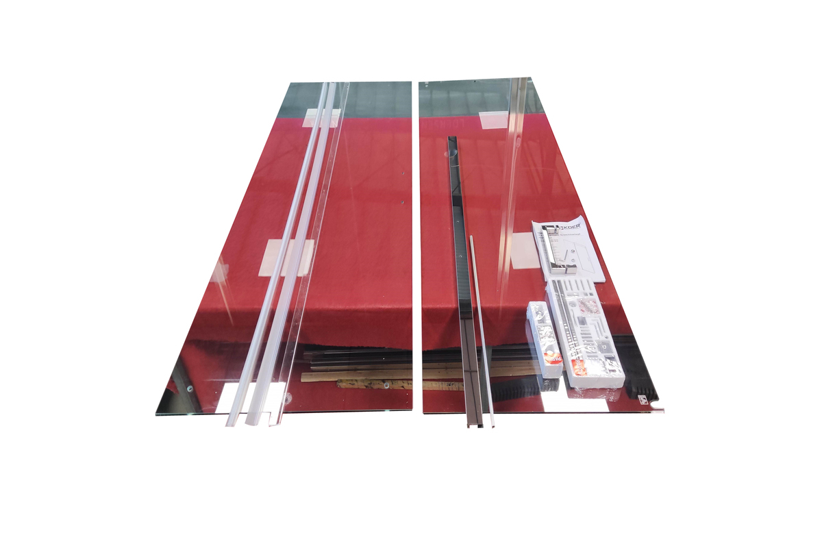 • Глухое стекло, стеклянная реверсивная дверь, профиль, верхняя рейка, нижняя алюминиевая водонепроницаемая планка, ручка, верхние ролики, система нижних ползунов, комплект крепежных деталей, набор уплотнителей, заглушки.