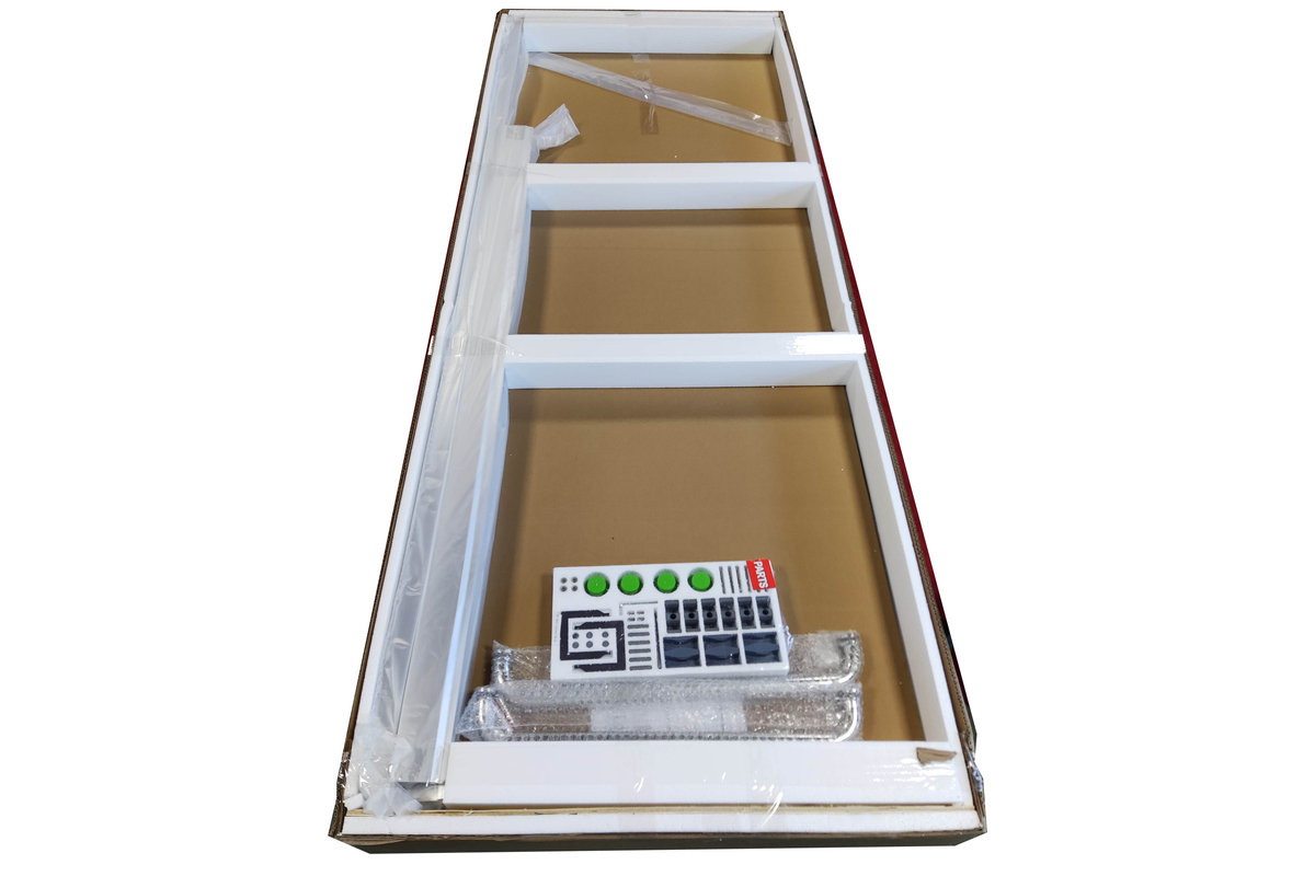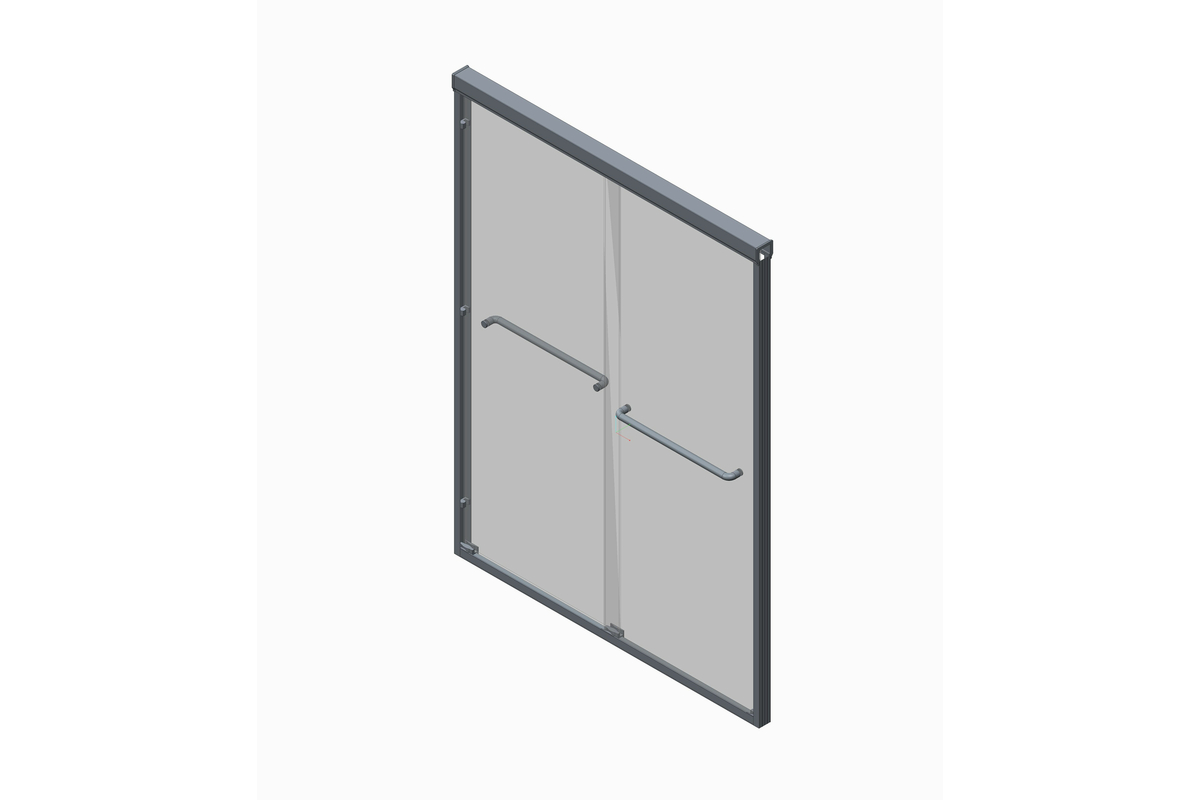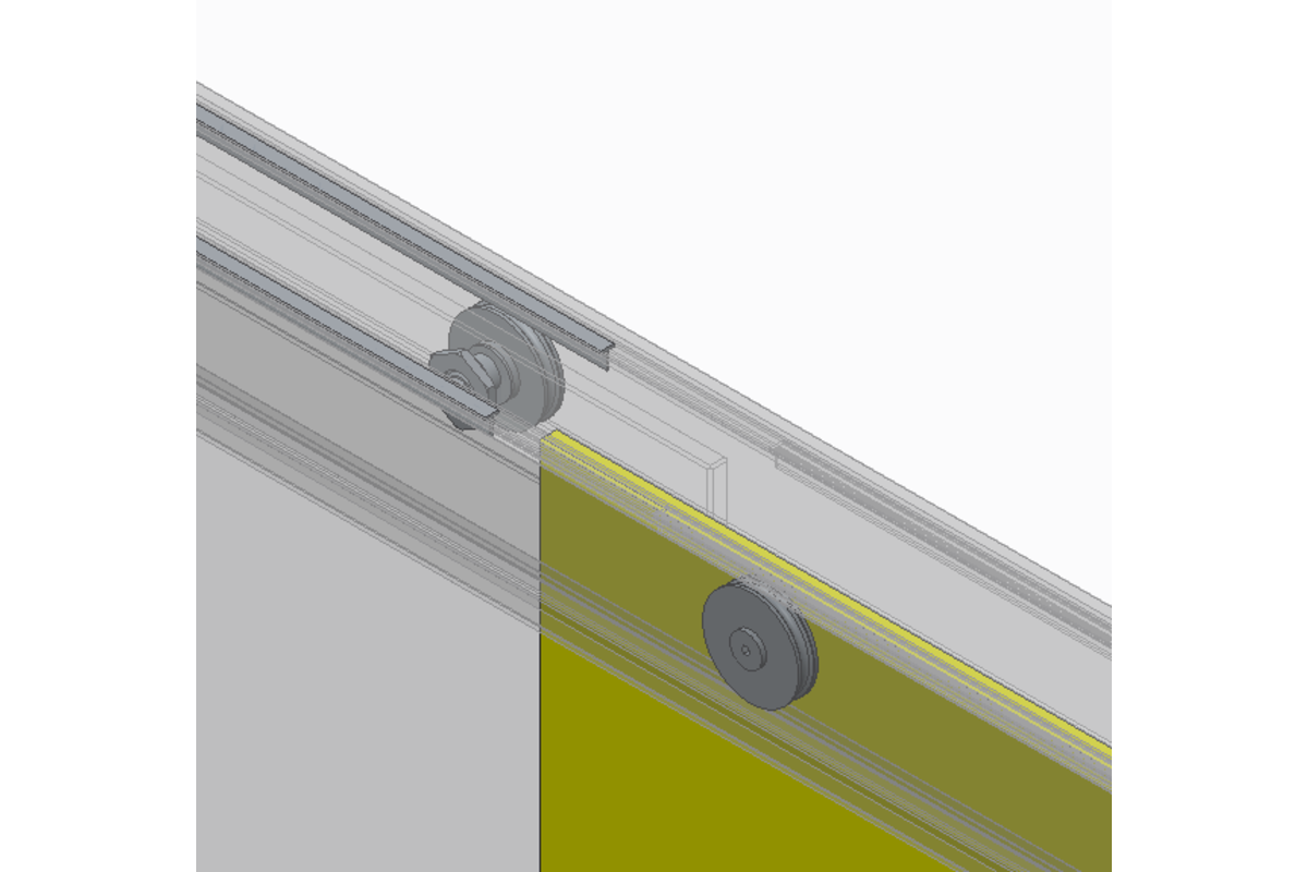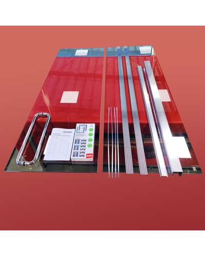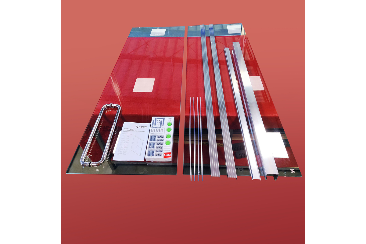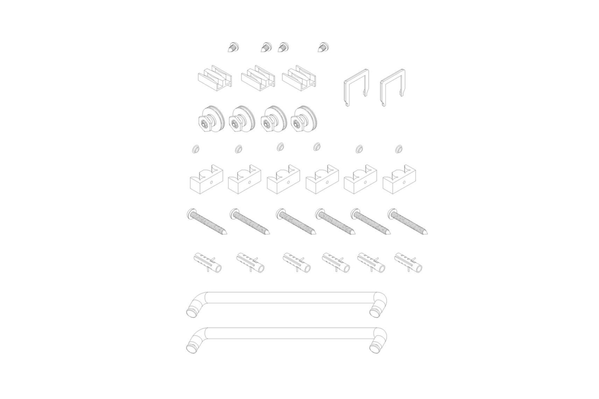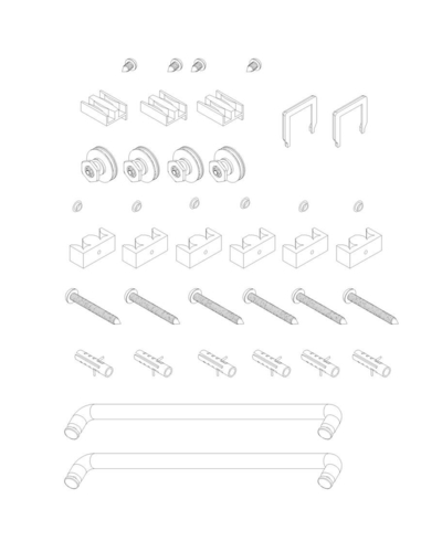 • Две раздвижные стеклянные двери, профили, две ручки, верхние ролики, система нижних ползунов, комплект крепежных деталей, набор уплотнителей, заглушки.