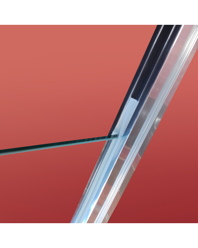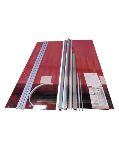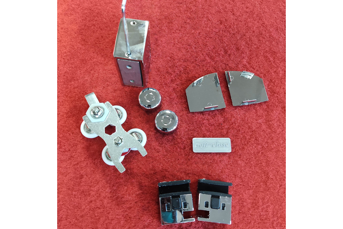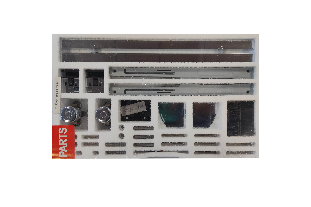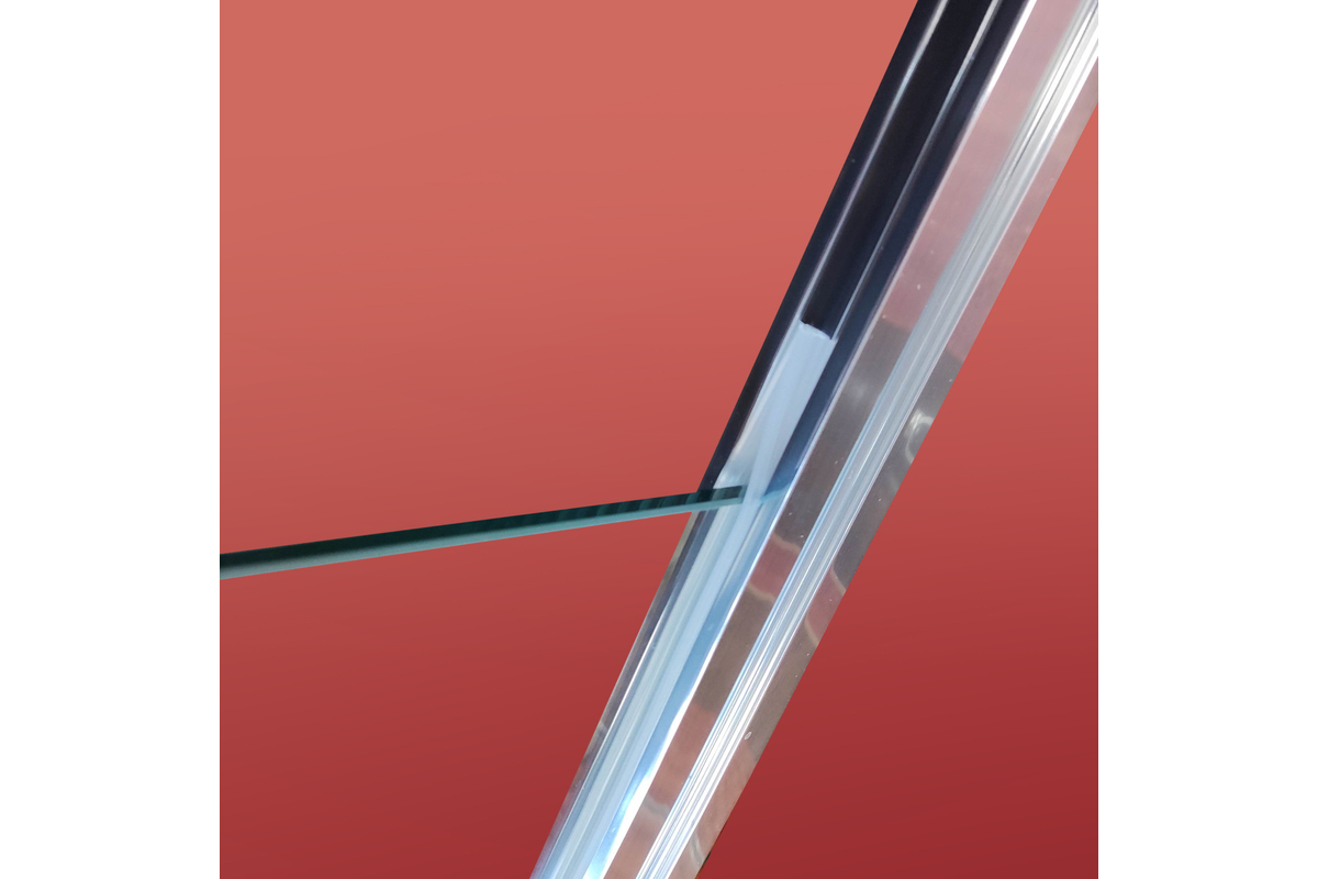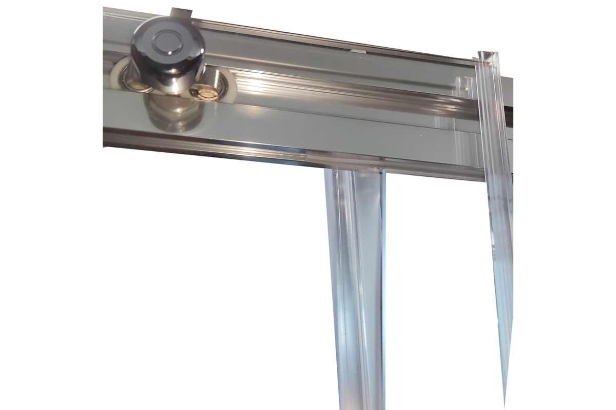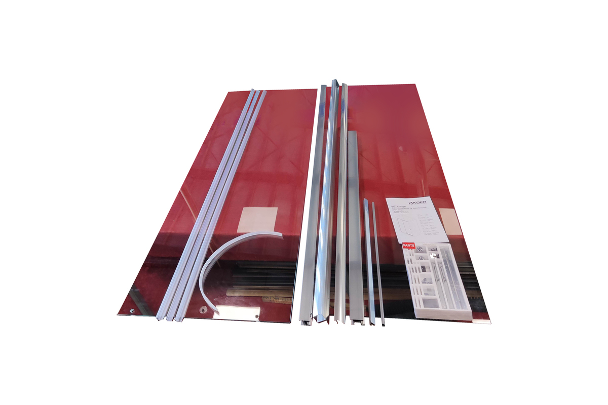 • Глухое стекло, стеклянная реверсивная дверь, профили, нижняя алюминиевая водонепроницаемая планка, двойная ручка, верхние ролики, система нижних ползунов, комплект крепежных деталей, набор уплотнителей, заглушки