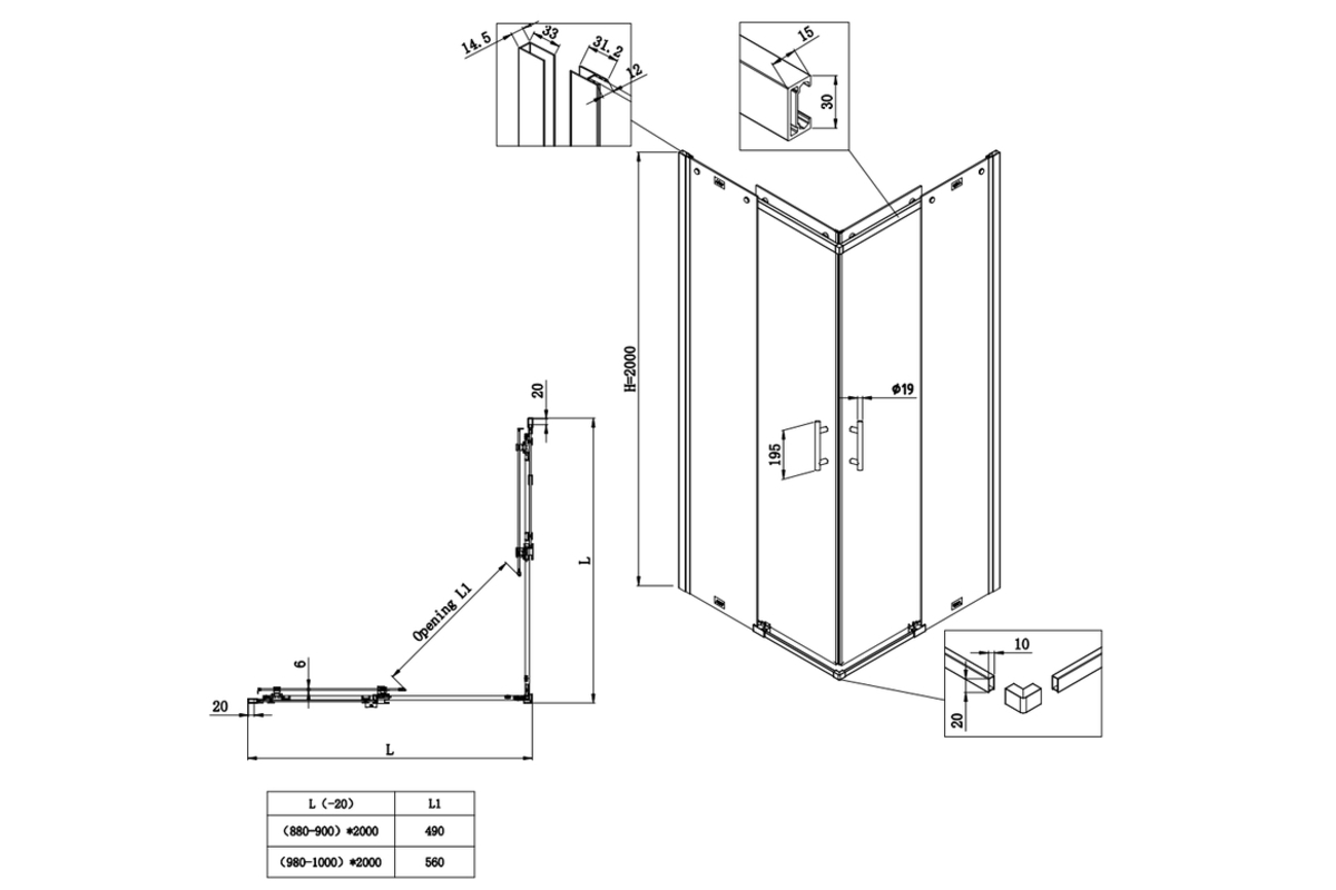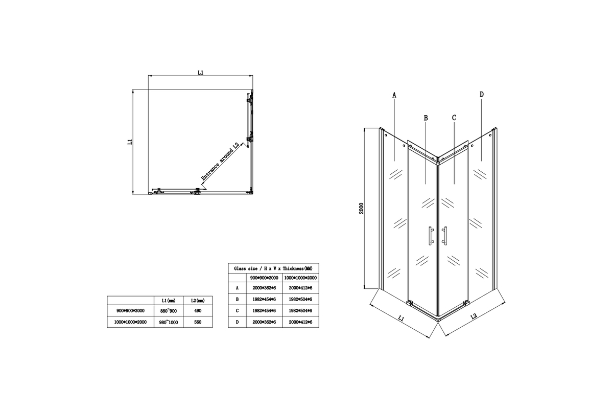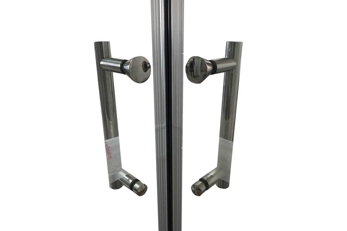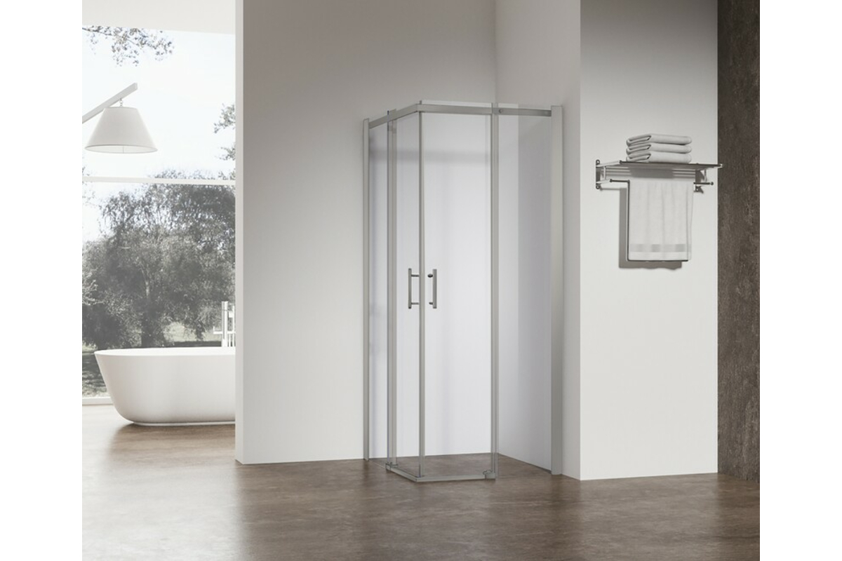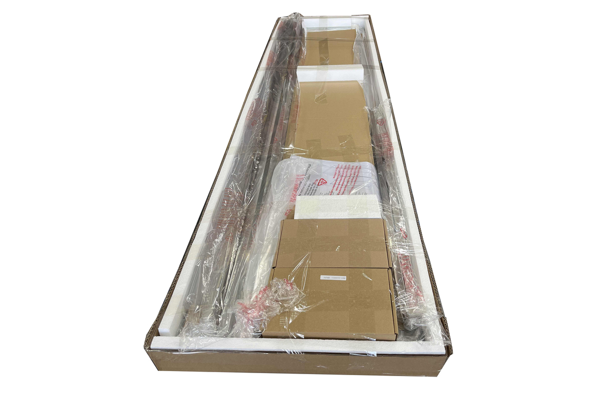 Упаковка 1/1. Глухое стекло -2, стеклянная дверь -2, профили, верхняя направляющая планка, нижние водонепроницаемые планки, 2 ручки, верхние ролики, система нижних ползунов, комплект крепежных деталей, набор уплотнителей, заглушки.