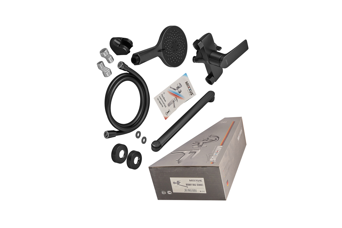 Шланг 150 см, ручная лейка 3 режима размером 12х25 см, держатель для лейки, эксцентрики, чашки, резиновые прокладки, руководство по экплуатации и гарантийный талон