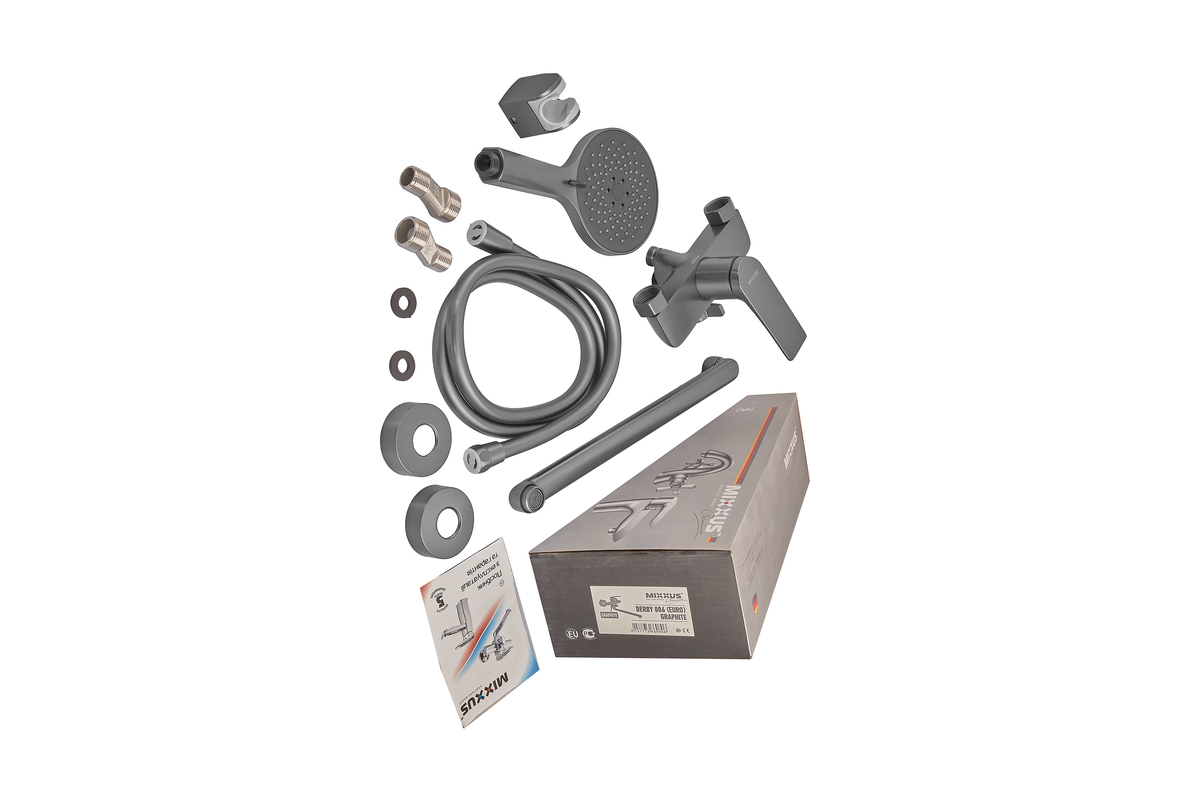 Шланг 150 см, ручная лейка 3 режима размером 12х25 см, держатель для лейки, эксцентрики, чашки, резиновые прокладки, руководство по экплуатации и гарантийный талон