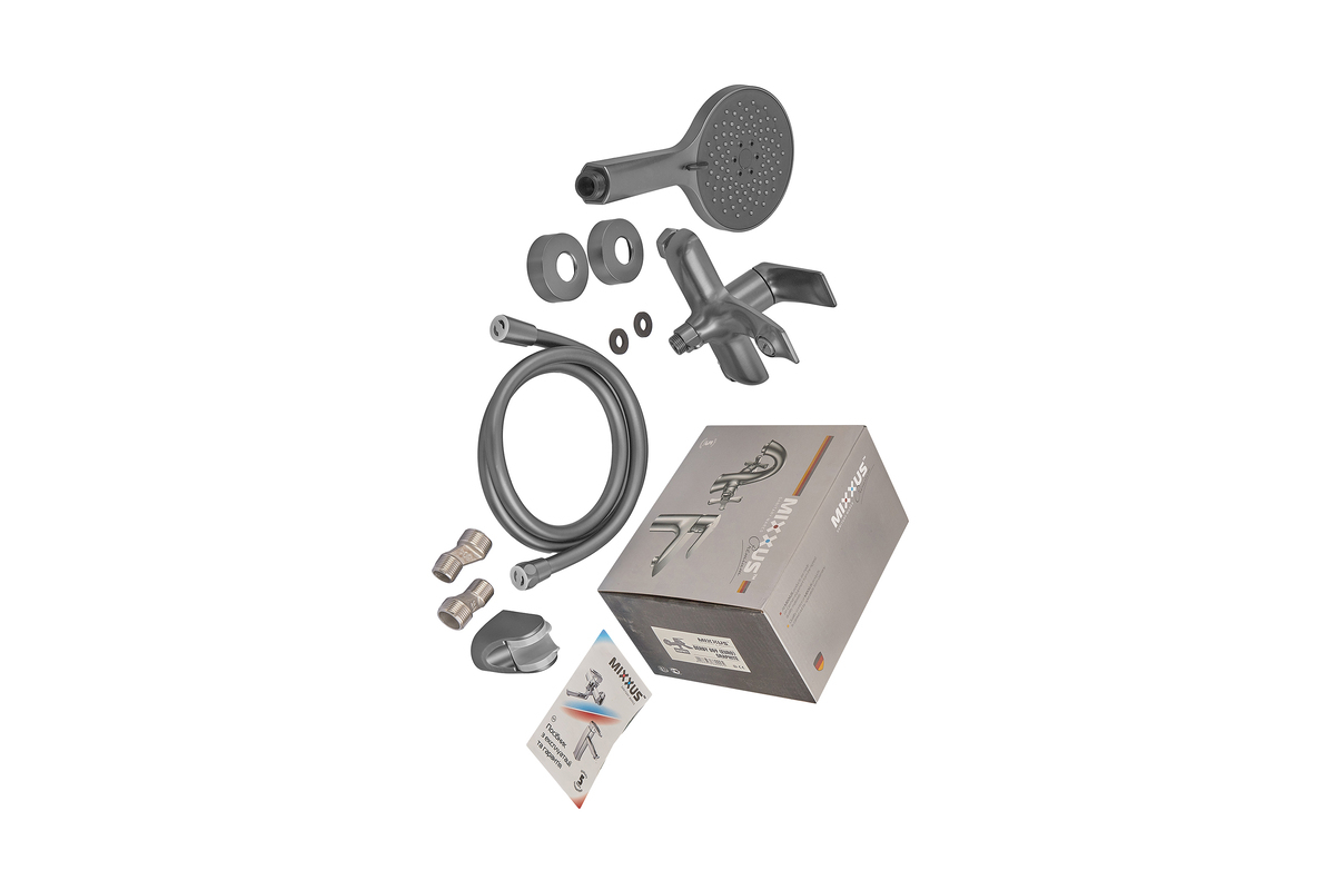 Шланг 150 см, ручная лейка 3 режима размером 12х25 см, держатель для лейки, эксцентрики, чашки, резиновые прокладки, руководство по экплуатации и гарантийный талон