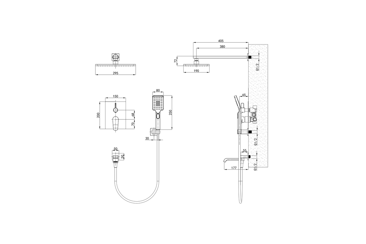 Шланг 150 см, ручная лейка, потолочная лейка, чашки, эксцентрики, резиновые прокладки, держатель для лейки