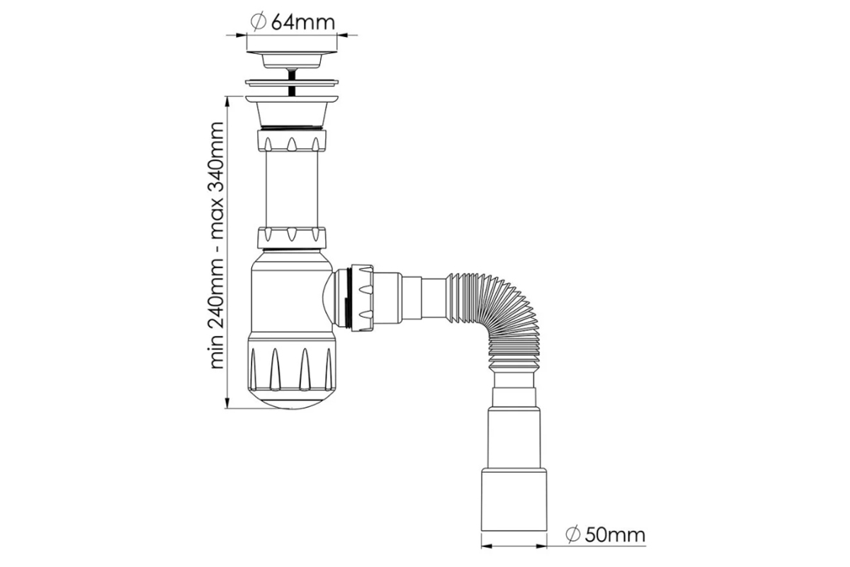 Сифон для умывальника с разборным выпуском 64 мм, длина винта 65 мм, выход гибкая труба 1 1/4” - Ø40/50