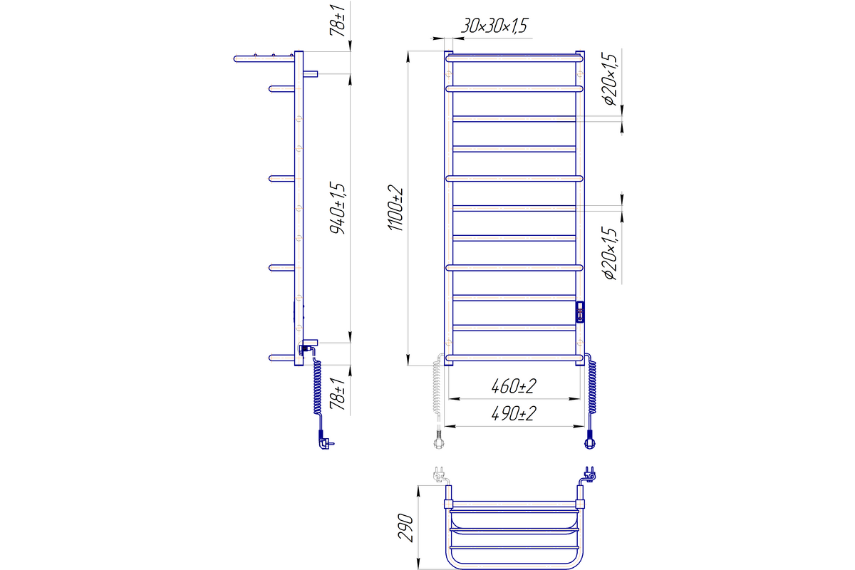 Вместо привычного шнура с фиксатором в конструкции изделия присутствуют разъемы на обоих стойках, позволяющие подключить полотенцесушитель к сети с любой стороны.