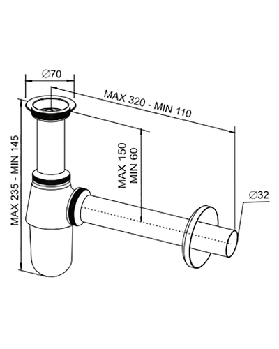 Сифон для умывальника латунный, хромированный, традиционная резиновая пробка, сливная трубка d32 с розеткой.
