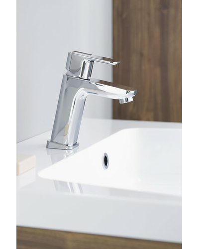 TD 014.00 Идет Вам навстречу. Практичный наклон смесителя к Вашей руке и вовнутрь умывальника позволяет с легкостью им манипулировать и облегчает чистку в тяжело доступном месте между смесителем и стеной. Увеличеная высота смесителя создает более удобное пространство для мытья. Гибкий аэратор гарантирует попадание водной струи непосредственно в сток, таким образом, вода не разбрызгивается наружу.
