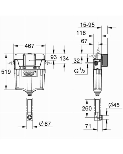 Смывной бачок без рамы для подвесного унитаза, регулировка объёма смыва от 6 до 9 л с маленьким ревизионным окошком. Пневматический смывной клапан с тремя режимами слива: 2-х объёмный, старт/стоп, или непрерывный. Подключение воды: справа, слева, сзади или сверху. Арматурная группа I с изоляцией от конденсационной влаги подключение воды DN 15 крепежными накладками. Ширина - 467 мм, длина - 519 мм, глубина - 118 мм.
