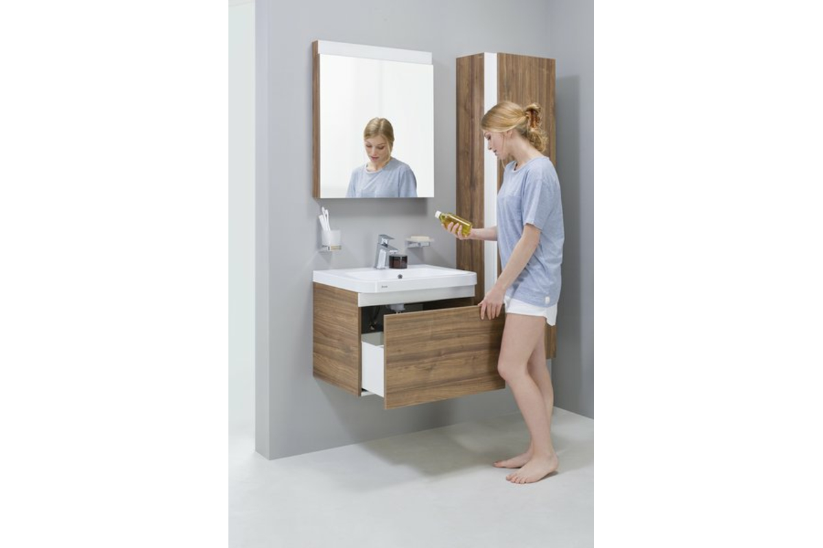 Шкафик имеет большое внутреннее пространство Практичный ящик для хранения мелких вещей Специальная пропитка материалов для защиты от воздействия влаги Достаточно пространства для вещей Декор: серый, темно-ореховый, белый