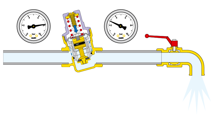 Редукційний клапан тиску засновує свою роботу на рівновазі двох протилежних сил: 1 зусилля пружини, що штовхає, для відкривання перерізу проходу. 2 штовхаюче зусилля мембрани для закриття перерізу проходу.