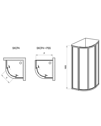 Виріб складається з двох рівних нерухомих частин і двох зігнутих частин, що утворюють розсувні двері. Встановлюється в облицьований кахлем кут ванної кімнати на піддони RAVAK Ronda, Elipso, Elipso Pro, Elipso Pro Flat, Elipso Pro Chrome або безпосередньо на підлогу з вбудованим душовим каналом або трапом.