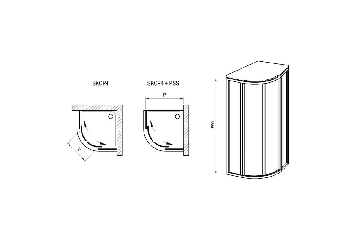 Виріб складається з двох рівних нерухомих частин і двох зігнутих частин, що утворюють розсувні двері. Встановлюється в облицьований кахлем кут ванної кімнати на піддони RAVAK Ronda, Elipso, Elipso Pro, Elipso Pro Flat, Elipso Pro Chrome або безпосередньо на підлогу з вбудованим душовим каналом або трапом.