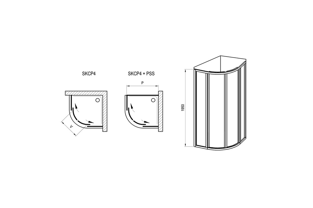 Виріб складається з двох рівних нерухомих частин і двох зігнутих частин, що утворюють розсувні двері. Встановлюється в облицьований кахлем кут ванної кімнати на піддони RAVAK Ronda, Elipso, Elipso Pro, Elipso Pro Flat, Elipso Pro Chrome або безпосередньо на підлогу з вбудованим душовим каналом або трапом.