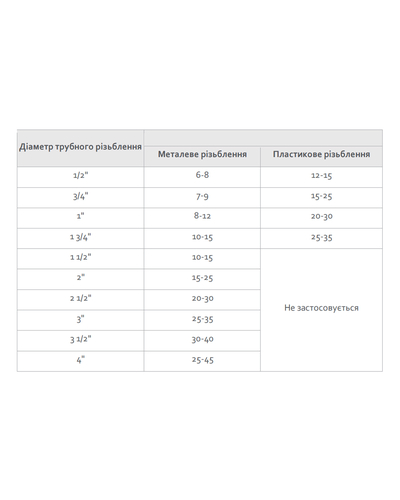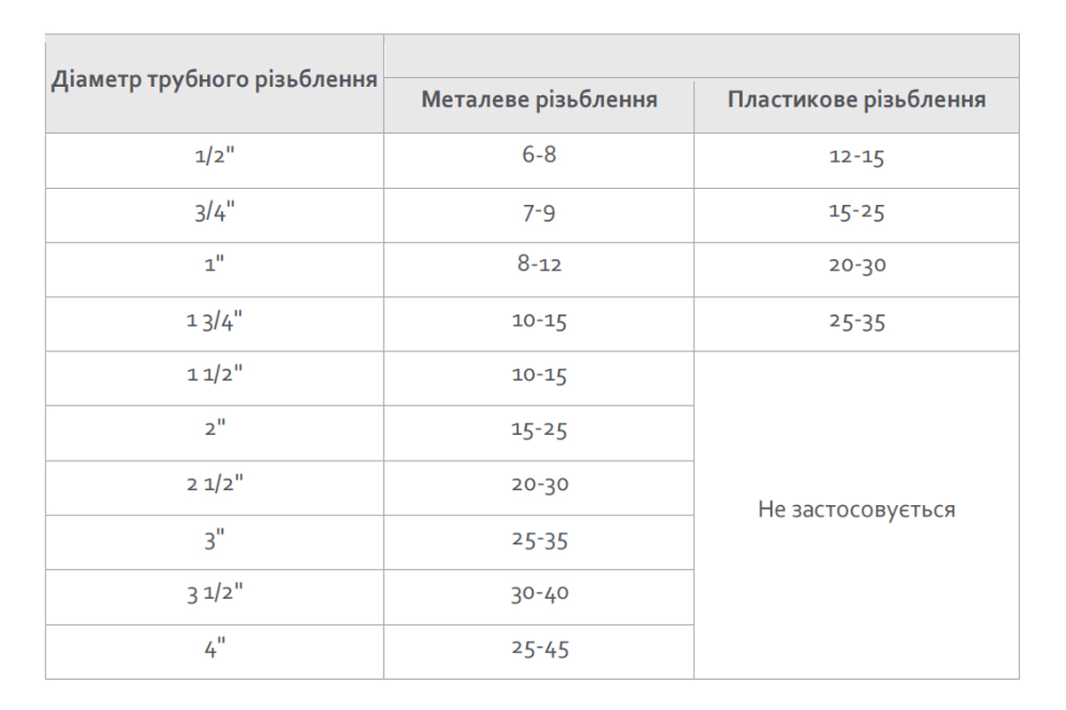 - Рекомендована кількість витків нитки залежно від діаметра труби вказано в таблиці. Після чого звичайним способом навертають фітинги або арматуру.