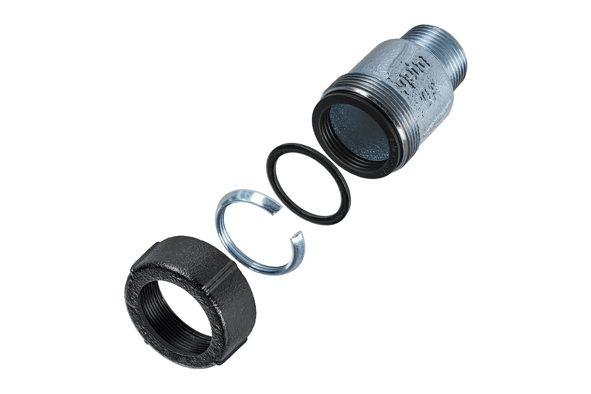 Особливість роботи затискної муфти ґрунтується на принципі затиску: обтискне кільце під час закручування гайки щільно охоплює трубу, а спеціальні зубці вглиблюються у її поверхню, надійно блокуючи з’єднання. Додаткове притискне кільце забезпечує правильну посадку муфти, захищає ущільнювальний матеріал та сприяє досягненню повної герметичності. Завдяки такому механізму компресійні муфти Gebo дозволяють швидко усунути аварію чи виконати ремонт трубопроводів без складних інструментів і зайвих витрат часу.