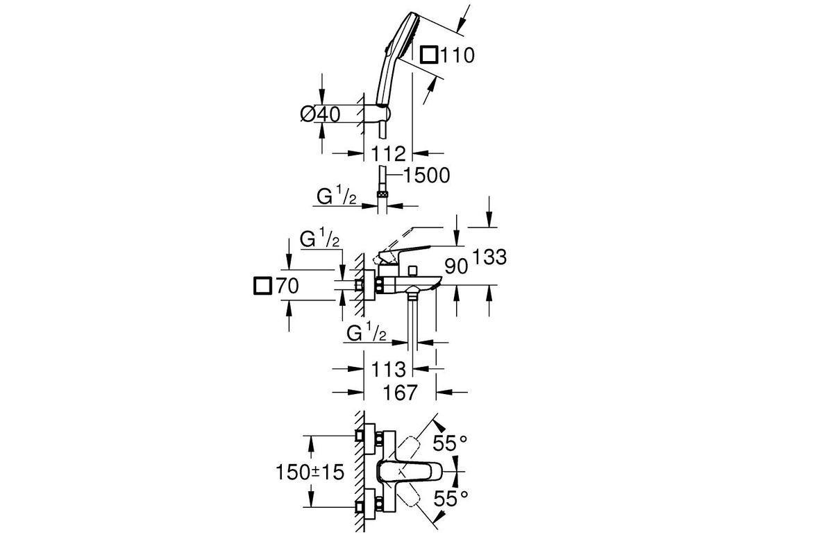 - 1/2" вихід для душу знизу із вбудованим зворотнім клапаном