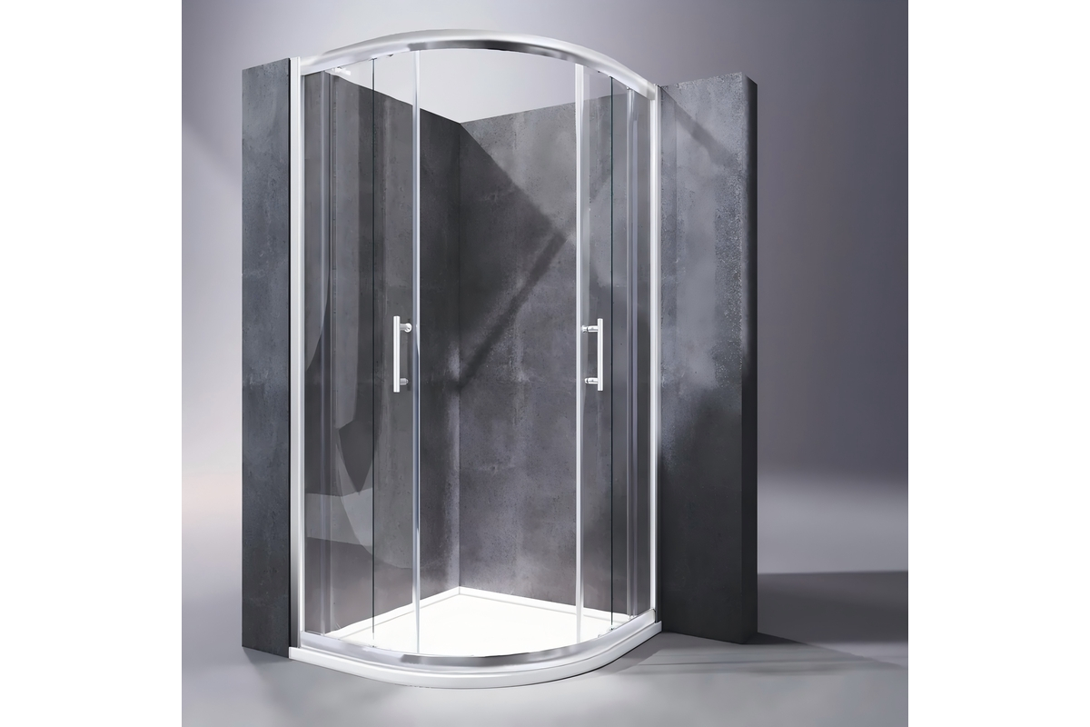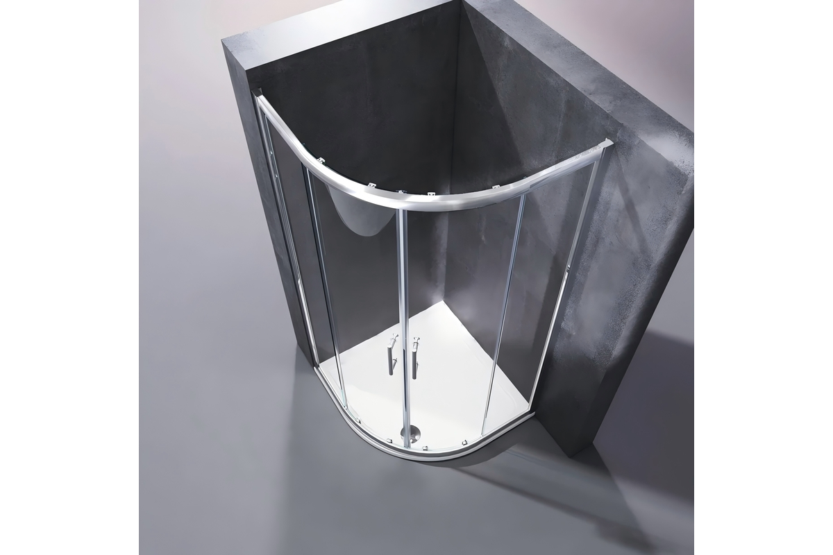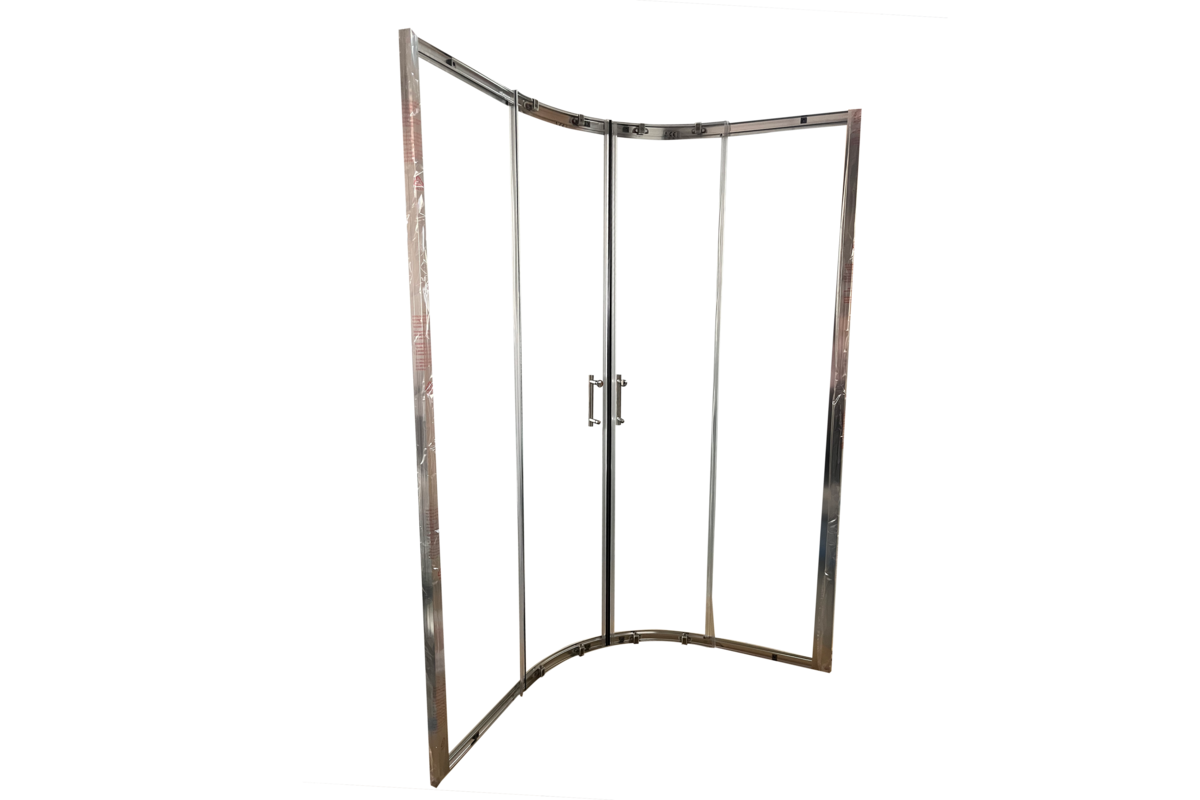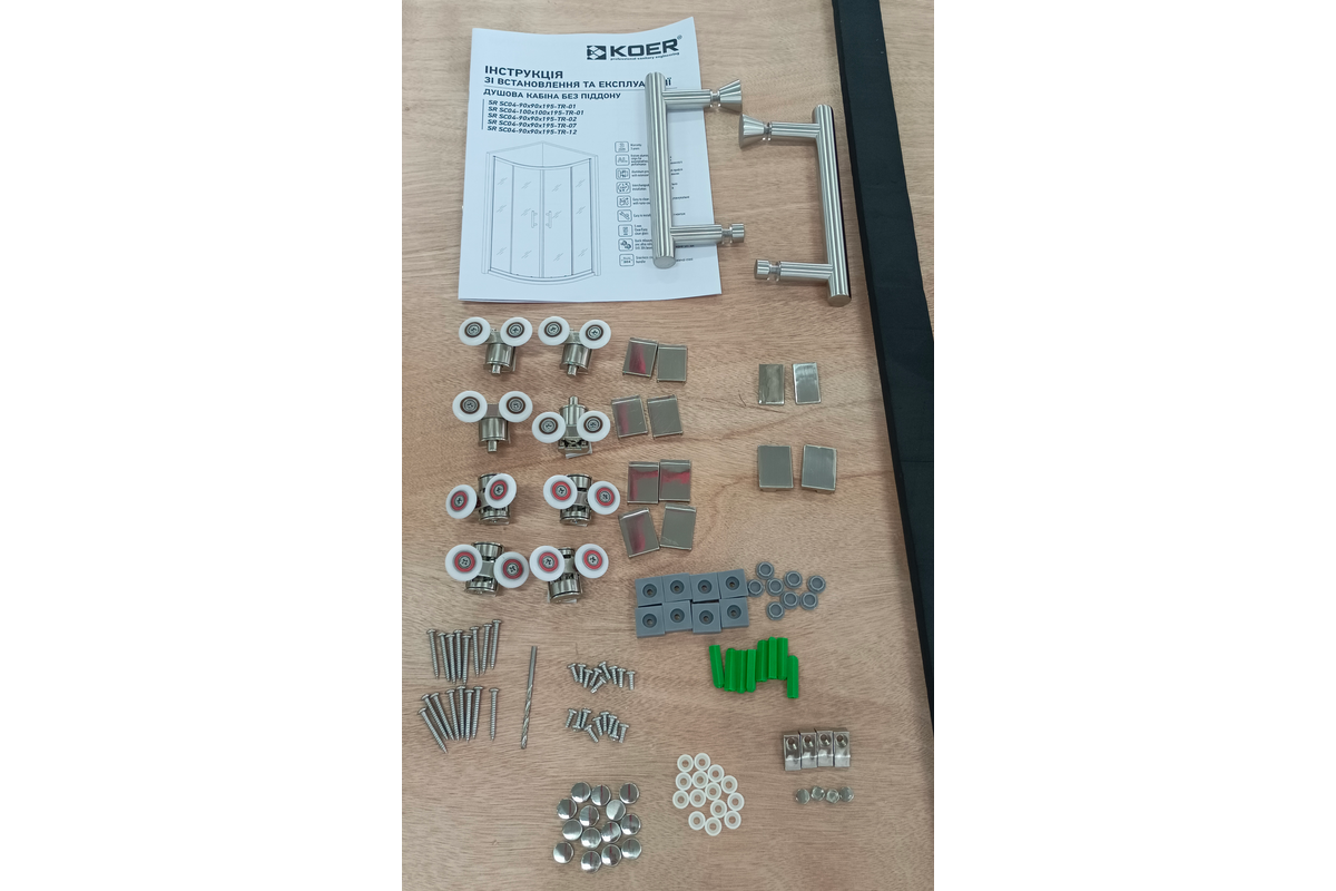 Упаковка 1/1. Глухе скло -2, скляні двері -2, профілі, направляючі, 2 ручки, подвійні ролики, комплект кріпильних деталей, набір ущільнювачів, заглушки.