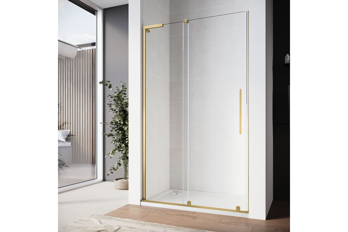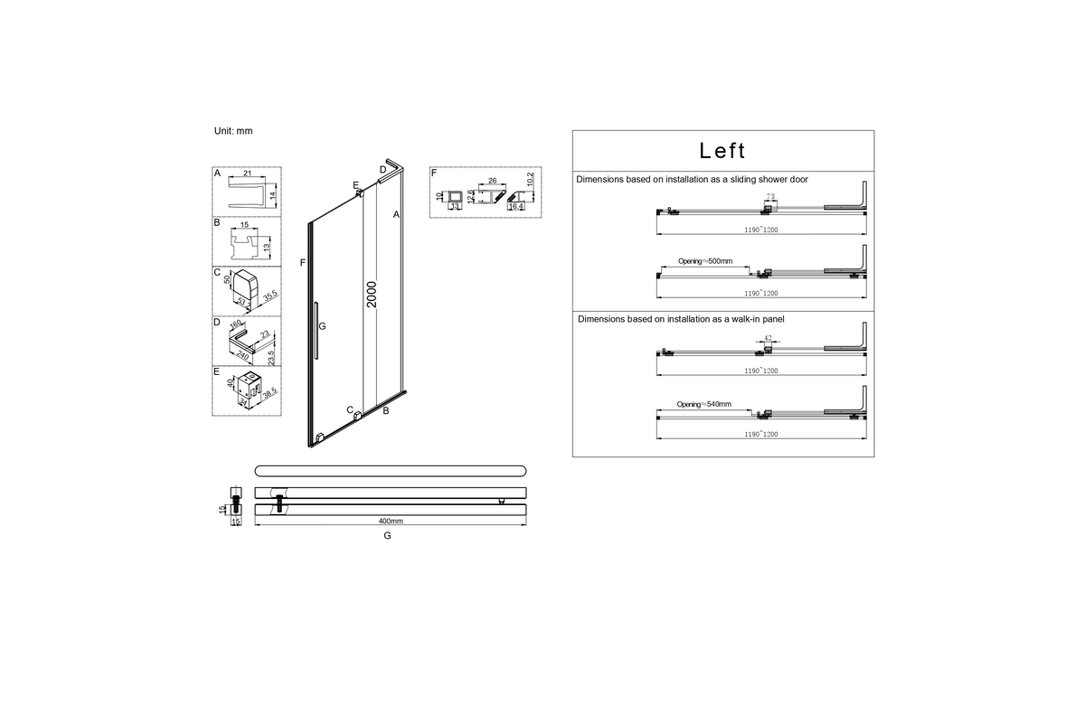 Упаковка 1/1. Глухе скло -1, скляні двері -1, профілі, L-подібна опорна планка, направляючі, подвійна ручка, подвійний нижній ролик, комплект кріпильних деталей, набір ущільнювачів, заглушки.