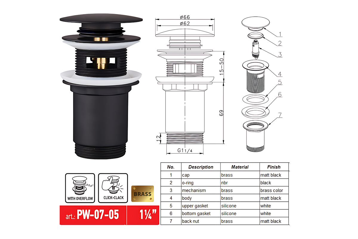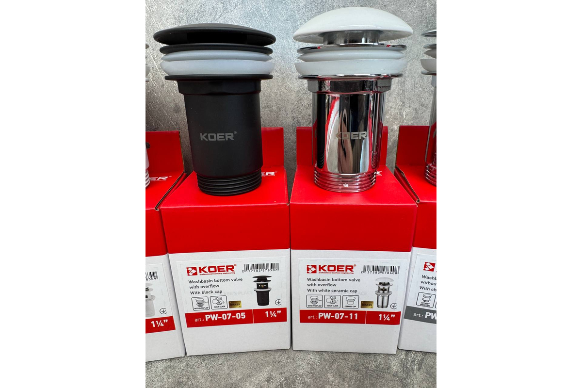 Питання та відповіді (FAQ) Донний клапан для раковини Koer PW-07-05 1.1/4 з переливом автоматичний Click-Clack чорний мат (KR5785)