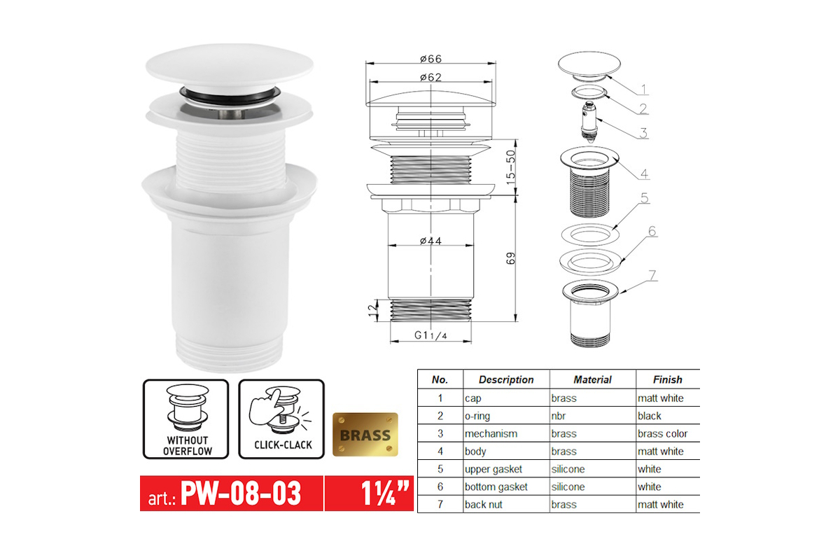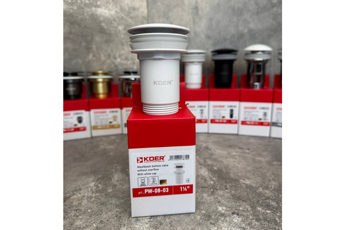 Донний клапан для раковини Koer PW-08-03 1.1/4 без переливу автоматичний Click-Clack білий (KR5787)