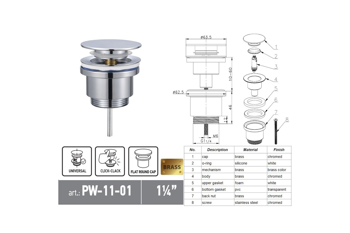 • Донний клапан з функцією Click-Clack, універсальний, підходить для умивальників як з переливним отвором, так і без нього.