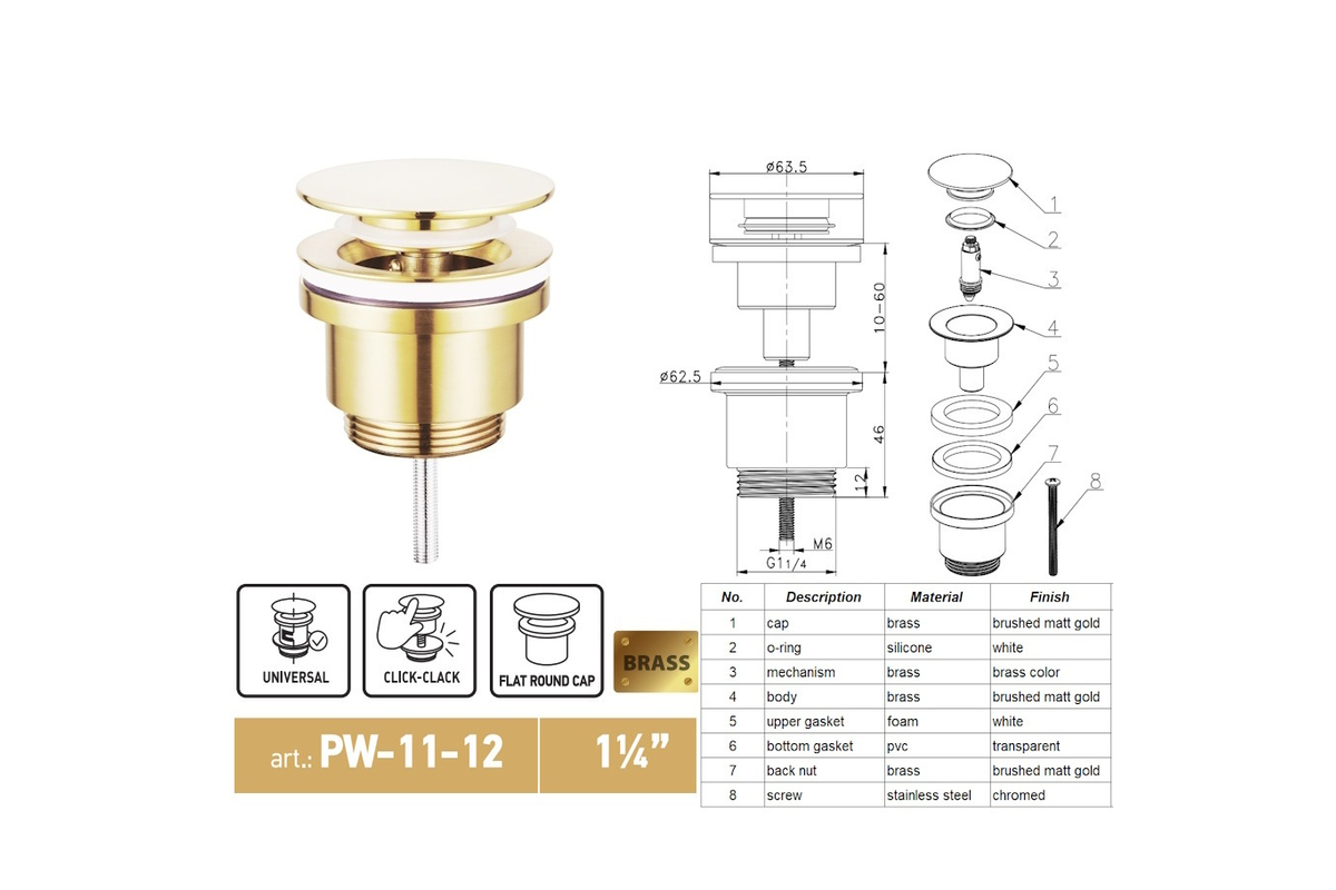 Питання та відповіді (FAQ) Донний клапан для раковини Koer PW-11-12 1.1/4 універсальний Click-Clack золото мат (KR5794)