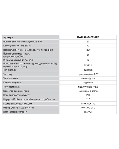 • Приєднувальні розміри: вхід холодної води, вихід гарячої води, вхід газу - G1/2 В