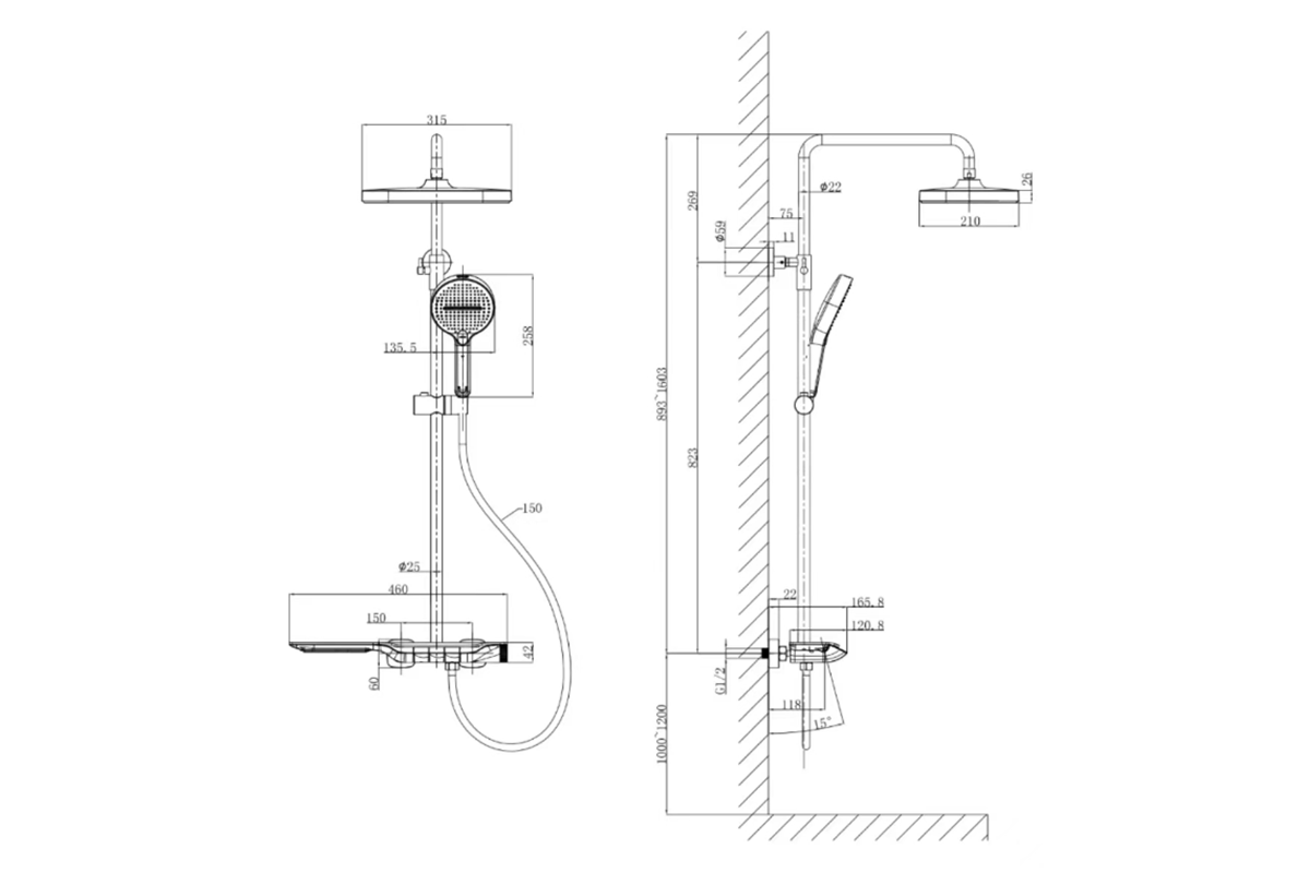 Комплектація Шланг 150 см, ручна лійка на 4 режими, однорежимна стельова лійка, чашки, ексцентрики, гумові прокладки, тримач для лійки