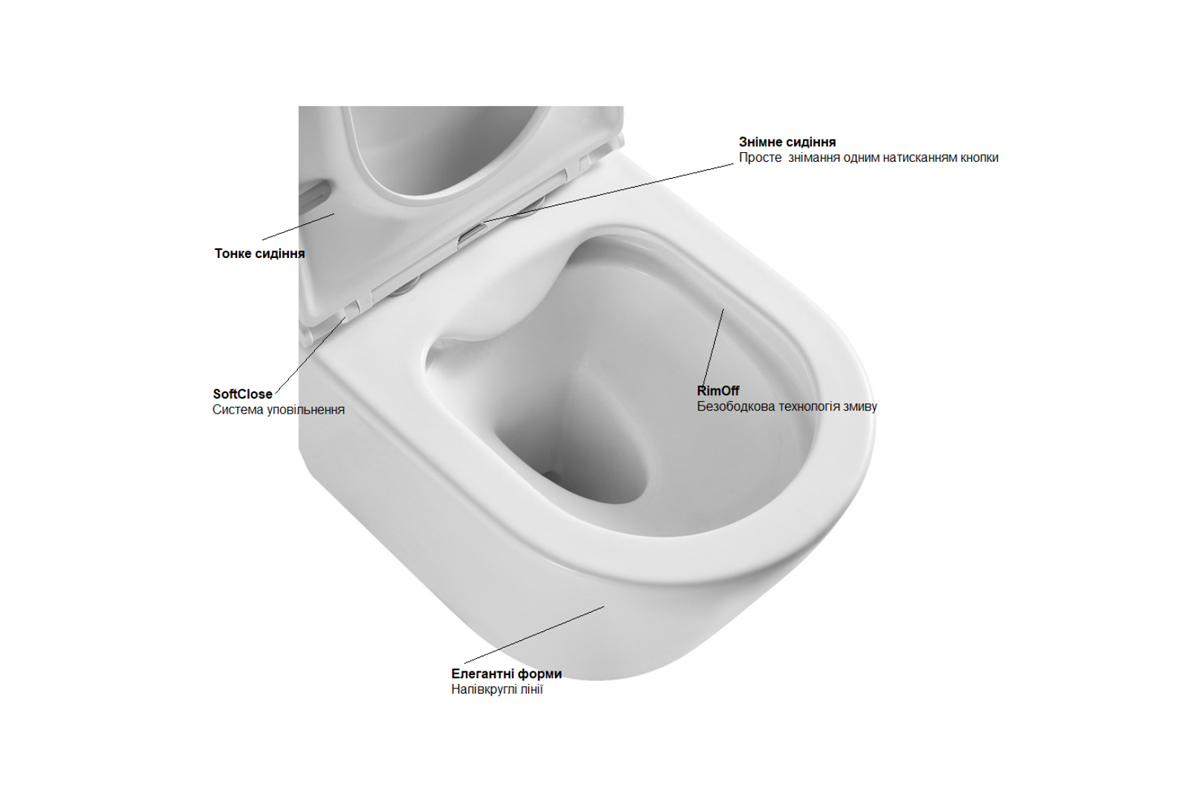 - RimOff – технологія ополіскування чаші без класичного бортика