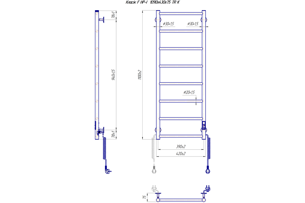 Електросушарка для рушників побутова Класік F НР-I 1090х430/75 TR K. Обладнана таймер-регулятором та конектором для підключення в розетку з будь-якого боку. Сумісна з комплектом прихованого підключення. Має 8 ребер та стояки з круглої труби. Виготовлена з полірованої нержавіючої сталі без хромування. Варіанти покриття: полірована або сатин, чорний мат, білий глянець, бронза, золото. Температурні режими таймер-регулятора: 40°С, 45°С, 50°С. Варіанти часу роботи: 3, 6 годин та постійний нагрів. Потужність 95 Вт. Додатково для зручності користування можна оснастити навісними гачками. Гарантія - 5 років. Виробник залишає за собою право, без попереднього погодження із покупцем, вносити зміни в зовнішній вигляд та відтінок кольору таймер-регулятора. Такі зміни не впливають на основне, функціональне призначення таймер-регулятора в цілому.