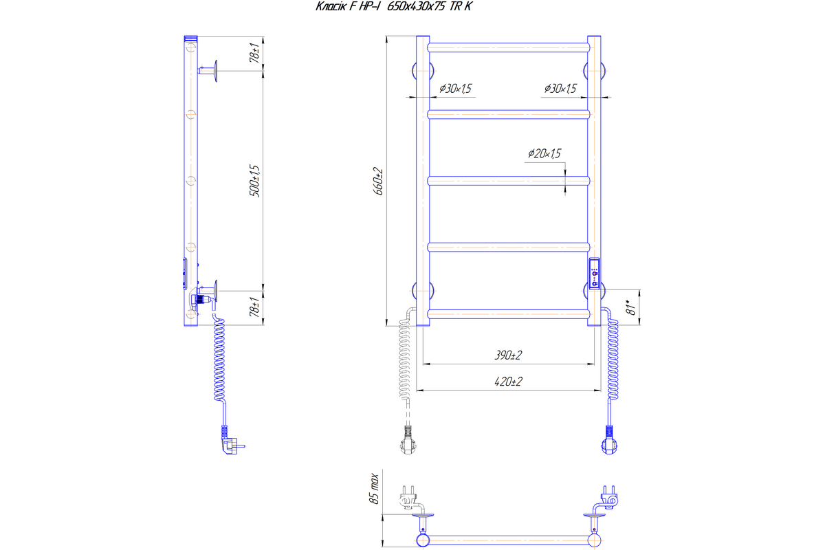 Електросушарка для рушників побутова Класік F НР-I 650х430/75 TR K. Обладнана таймер-регулятором та конектором для підключення в розетку з будь-якого боку. Сумісна з комплектом прихованого підключення. Має 5 ребер та стояки з круглої труби. Виготовлена з полірованої нержавіючої сталі без хромування. Варіанти покриття: полірована або сатин, чорний мат, білий глянець, бронза, золото. Температурні режими таймер-регулятора: 40°С, 45°С, 50°С. Варіанти часу роботи: 3, 6 годин та постійний нагрів. Потужність 65 Вт. Додатково для зручності користування можна оснастити навісними гачками. Гарантія - 5 років. Виробник залишає за собою право, без попереднього погодження із покупцем, вносити зміни в зовнішній вигляд та відтінок кольору таймер-регулятора. Такі зміни не впливають на основне, функціональне призначення таймер-регулятора в цілому.
