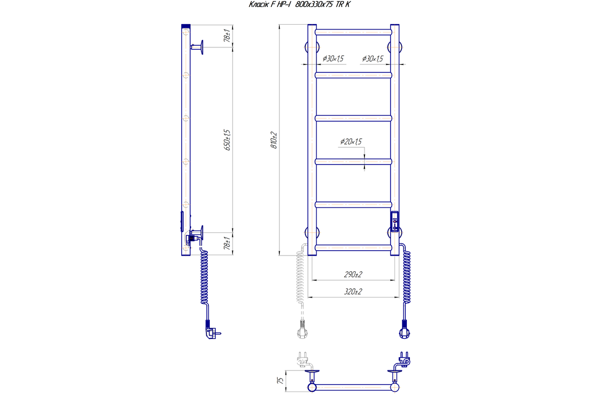 Електросушарка для рушників побутова Класік F НР-I 800х330/75 TR K. Обладнана таймер-регулятором та конектором для підключення в розетку з будь-якого боку. Сумісна з комплектом прихованого підключення. Має 6 ребер та стояки з круглої труби. Виготовлена з полірованої нержавіючої сталі без хромування. Варіанти покриття: полірована або сатин, чорний мат, білий глянець, бронза, золото. Температурні режими таймер-регулятора: 40°С, 45°С, 50°С. Варіанти часу роботи: 3, 6 годин та постійний нагрів. Потужність 65 Вт. Додатково для зручності користування можна оснастити навісними гачками. Гарантія - 5 років. Виробник залишає за собою право, без попереднього погодження із покупцем, вносити зміни в зовнішній вигляд та відтінок кольору таймер-регулятора. Такі зміни не впливають на основне, функціональне призначення таймер-регулятора в цілому.