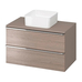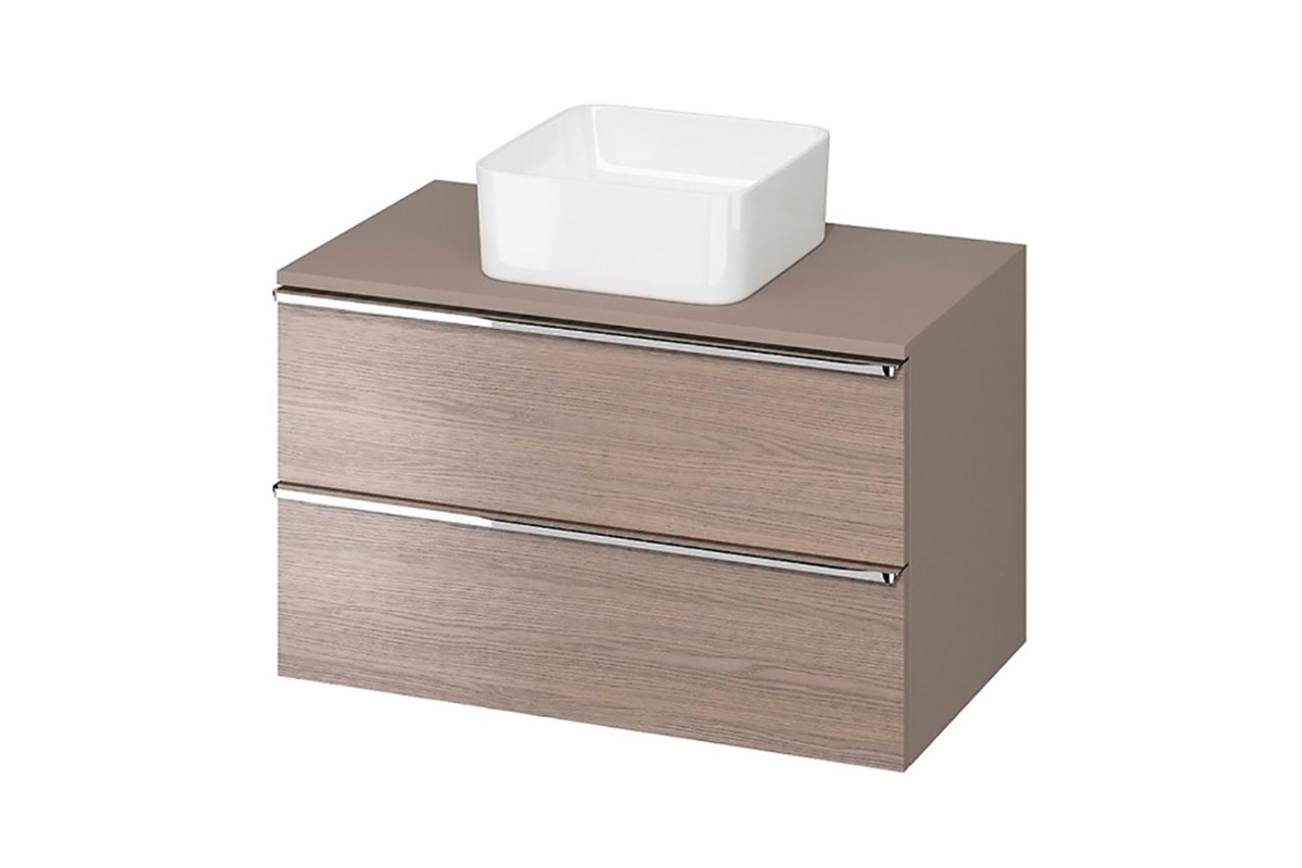 Чорні або хромовані ручки доповнюють естетичний вигляд меблів. Шафки під умивальник даної модифікації оснащені стільницею матового сірого кольору, на яку можна монтувати настільні умивальники із серії MODUO або CREA, двома місткими шухлядами із функцією плавного дотягування Soft-Close та системою повного висуву.
