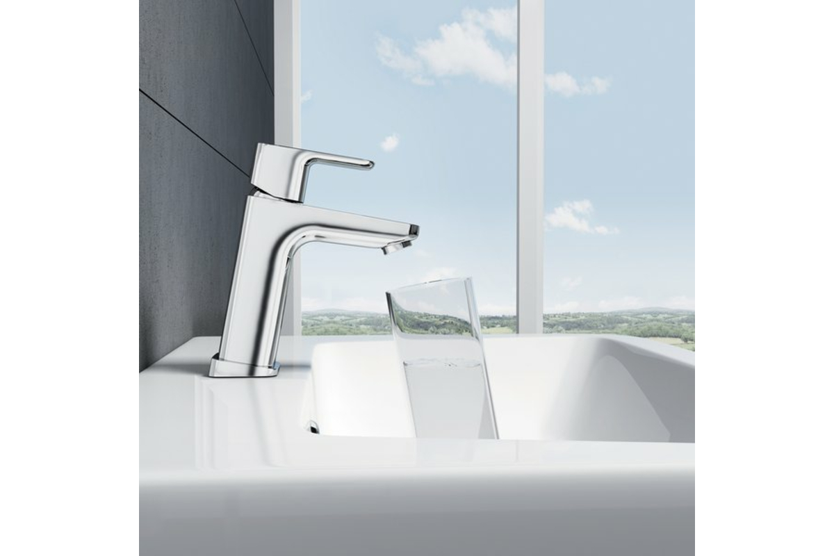 TD 014.00 Йде Вам назустріч. Практичний нахил змішувача до Вашої руки і всередину умивальника дозволяє з легкістю їм маніпулювати і полегшує чистку у важко доступному місці між змішувачем і стіною. Збільшена висота змішувача створює більш зручний простір для миття. Гнучкий аератор гарантує попадання струменя безпосередньо в сток, таким чином, вода не розбризкується назовні.